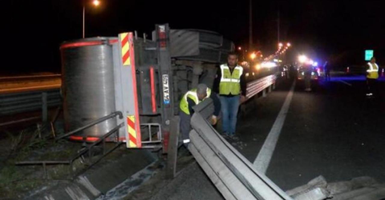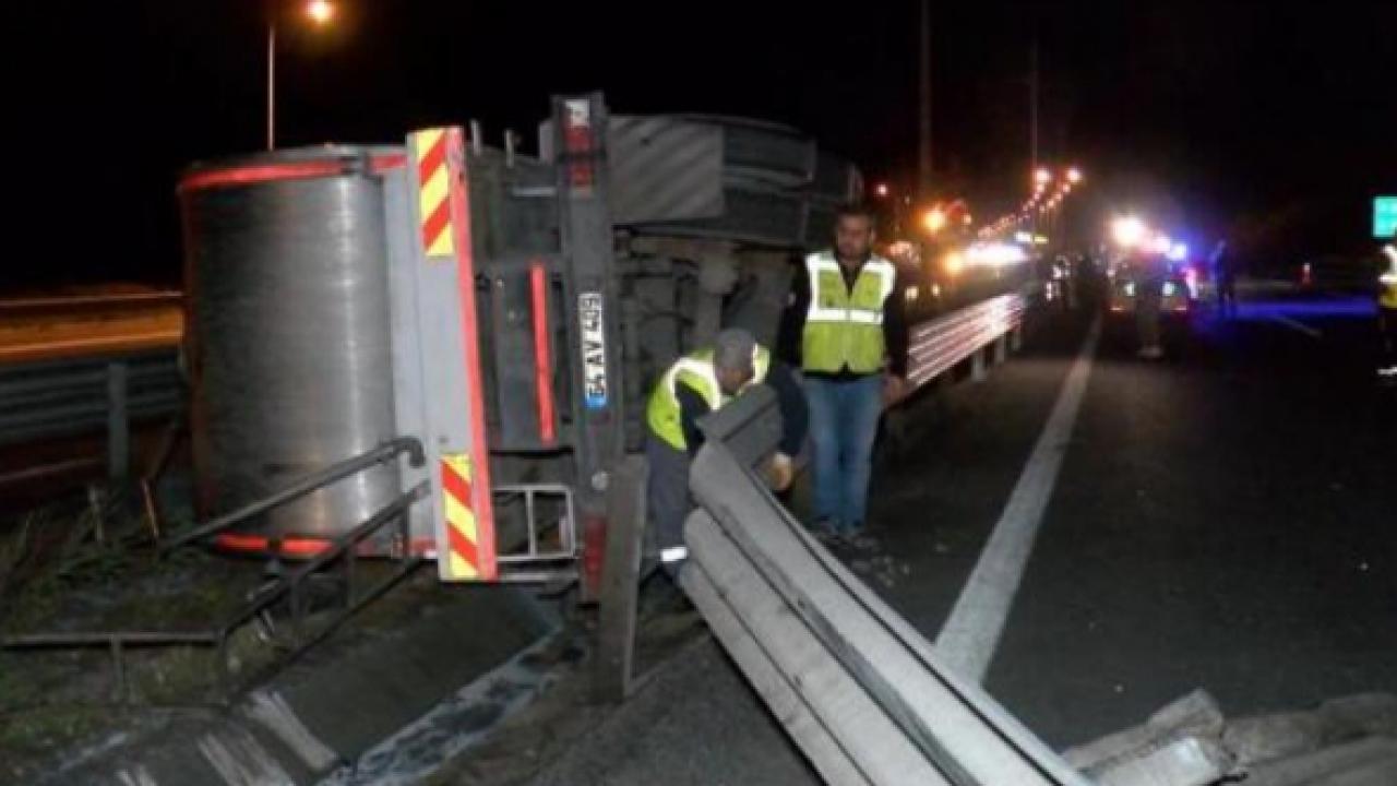 Kaza, saat 04.30 sıralarında Yavuz Sultan Selim Köprüsü çıkışı Beykoz Riva sapağını geçtikten sonra meydana geldi. Ankara istikametine seyir halinde bulunan Hüseyin AK yönetimindeki 64 AV 409 plakalı kamyon, henüz bilinmeyen nedenle sürücüsünün kontrolünden çıkarak bariyerlere girdi. Kamyon devrilirken, sürücü ağır yaralandı. Yoldan geçen sürücülerin haber vermesiyle olay yerine itfaiye, polis ve sağlık ekipleri sevk edildi. Yaralı sürücü Hüseyin Ak hastaneye kaldırılırken, itfaiye ekipleri bir süre tedbir amaçlı olay yerinde bekledi. Polis ve jandarma ekipleri ise olay yerinde önlem alarak inceleme yaptı. Kaza ile ilgili soruşturma başlatıldı. (DHA)