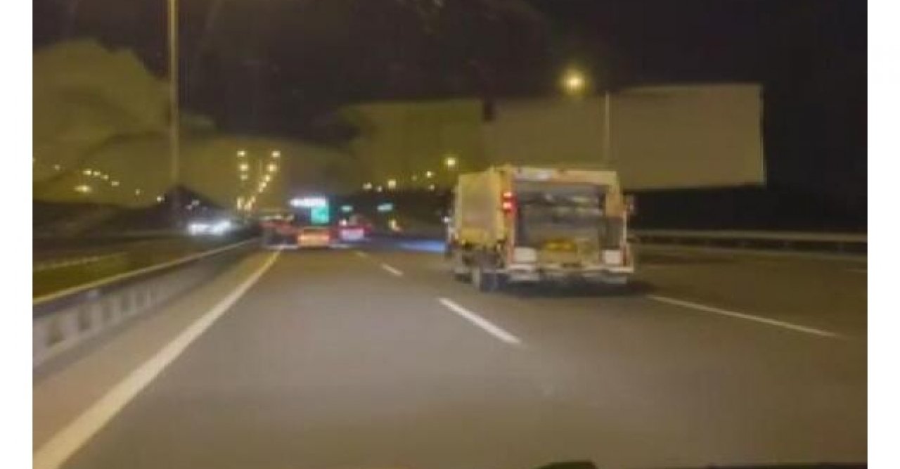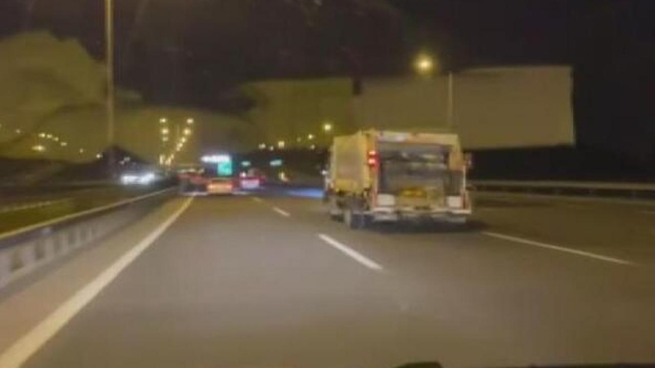 İSTANBUL'da otoyolda çöp kamyonunun sallanarak ilerlediği tehlikeli yolculuk kameraya yansıdı.