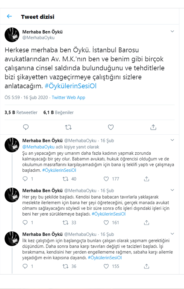 İstanbul’da mesleğe yeni başlayan ‘Öykü’ isimli stajyer avukat önceki gün, yanında çalıştığı ve babasının da avukatı olan Mühittin Köylüoğlu tarafından cnsel saldırıya maruz bırakıldığını açıkladı.