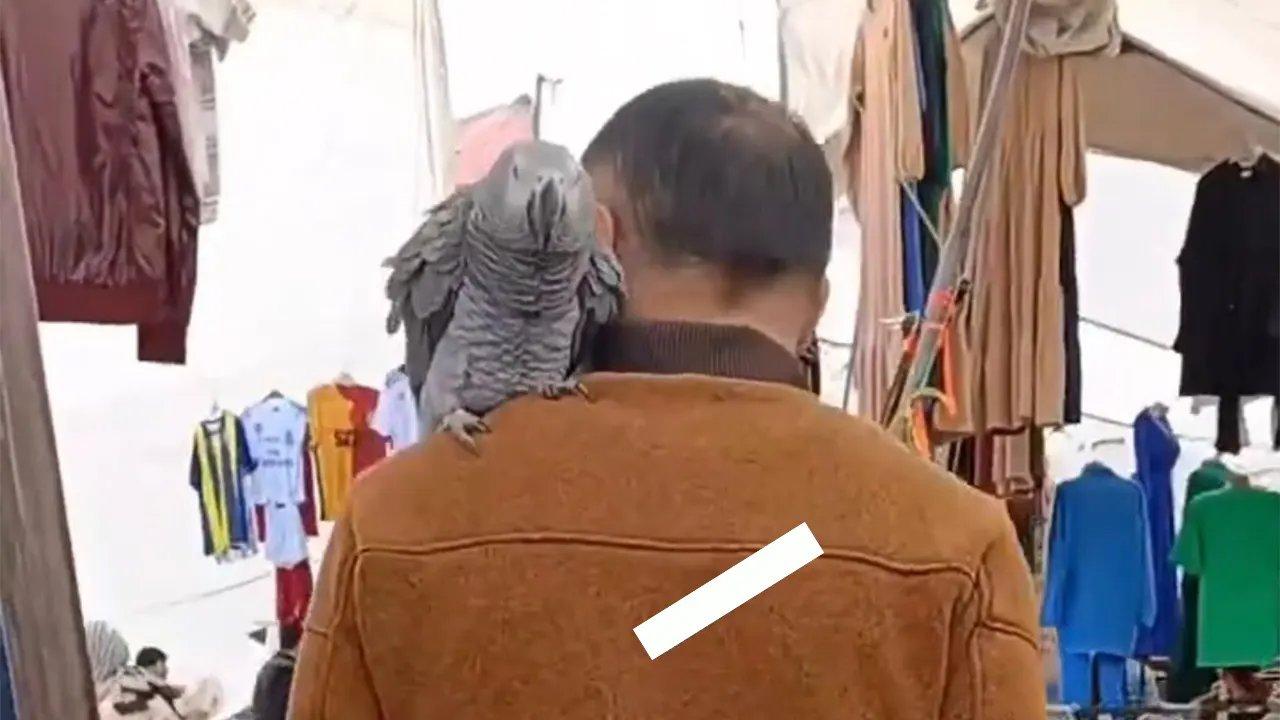 Pazarda alışveriş yapan adam, omzunda gezdirdiği papağanıyla alışverişine devam ederken bir vatandaşın objektifine yansıdı.