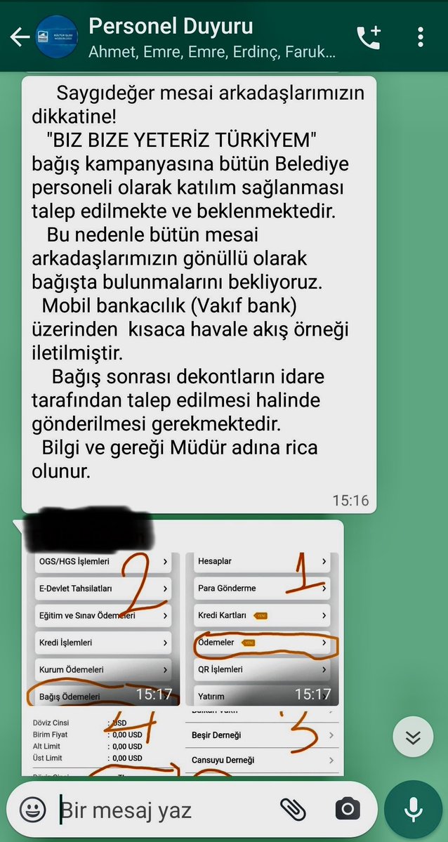 Pendik Belediyesi personel grubuna ait olduğu iddia edilen Whatsapp konuşması, sosyal medyada büyük tepki gördü. Söz konusu ekran görüntüsüne göre personel, yapacakları “gönüllü bağış” ile ilgili dekontları istenildiğinde taraflarına iletmeleri gerektiği konusunda uyarılıyor.