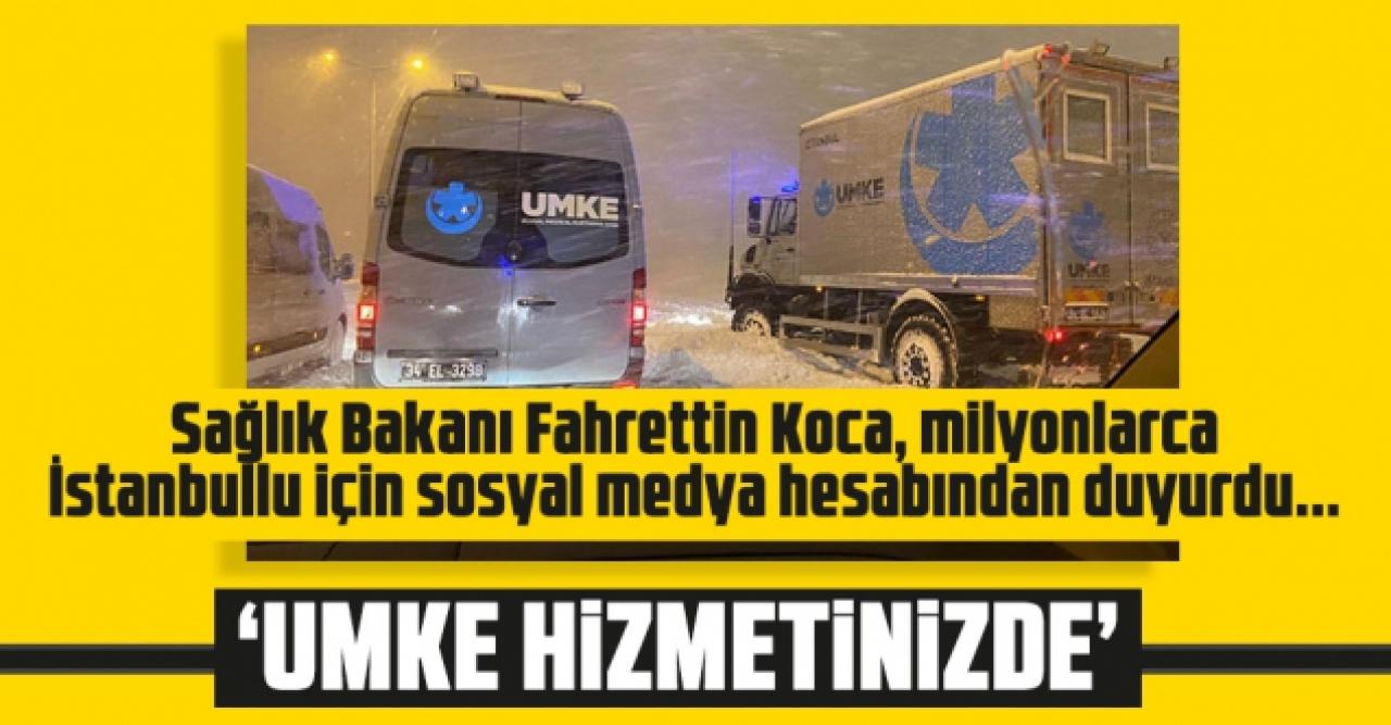 Bakan Koca, yoğun kar yağışının yaşandığı İstanbul'da, acil sağlık hizmetlerinin aksamaması için hazırlanan UMKE ekiplerinin fotoğrafını paylaştı. Koca, fotoğrafa, "UMKE İstanbul'un hizmetinde. Hava koşulları İstanbul'da ulaşımı ciddi şekilde etkilemiş durumda. Acil sağlık hizmetlerinde aksamaların önüne geçebilmek için, koşullara uygun donanıma sahip UMKE ekiplerimiz şehrin farklı noktalarında görevlendirilmiştir. Hayırlı sabahlar" notunu ekledi.