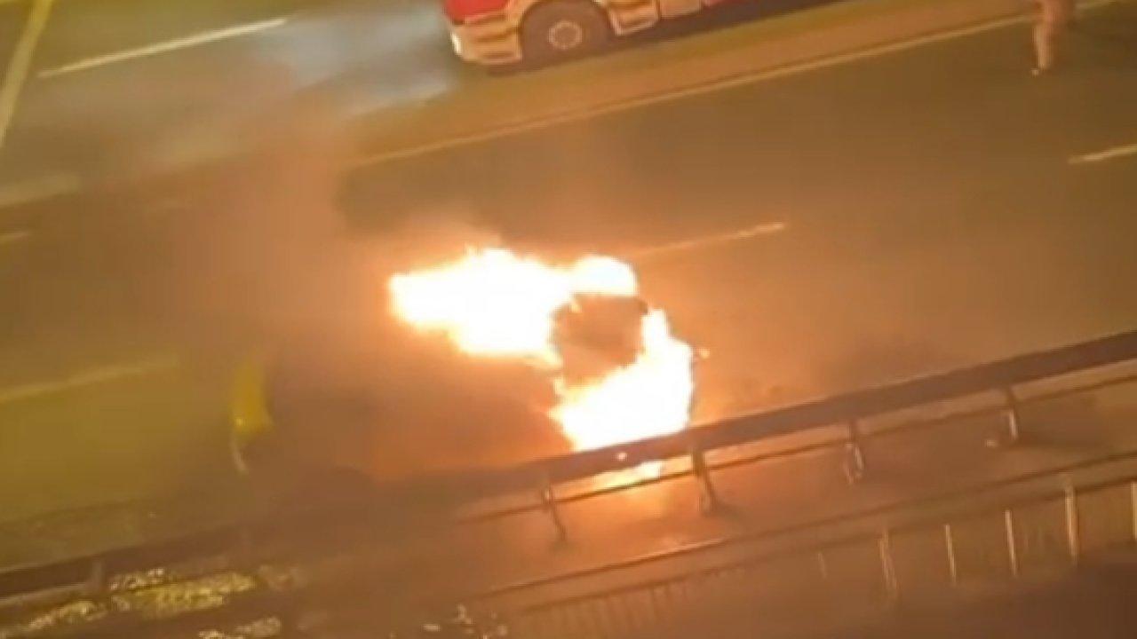 Seyir halindeki 34 THT 22 plakalı taksinin motor kısmına henüz belirlenemeyen bir nedenle yangın çıktı. Yangını gören taksi şoförü aracı kenara çekti. Alevler kısa sürede büyüyerek taksiyi tamamen sardı. İhbar üzerine olay yerine polis ve itfaiye ekipleri sevk edildi. Yangın itfaiye ekipleri tarafından kısa sürede söndürüldü. Yangın nedeniyle caddede trafik yoğunluğu oluştu. Yangın anları cep telefonu kamerasına yansıdı.