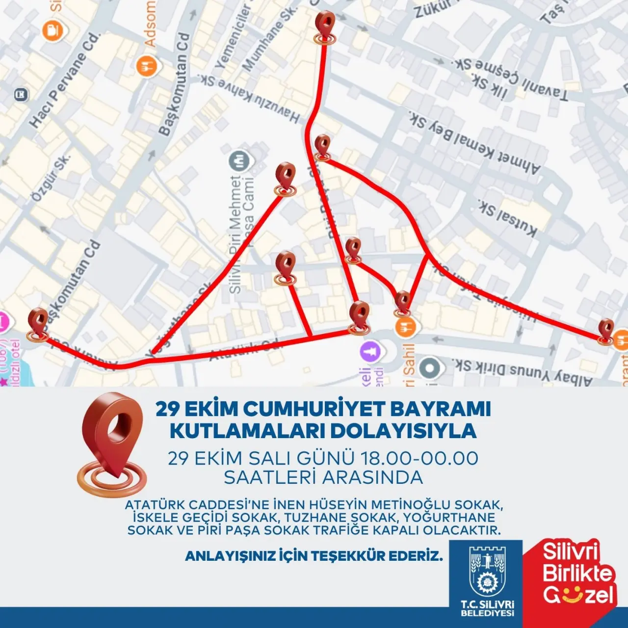 29 Ekim Salı günü 18.00’den gece yarısı 00.00’a kadar Silivri’de; Hüseyin Metinoğlu Sokak, İskele Geçidi Sokak, Tuzhane Sokak, Yoğurthane Sokak ve Piri Paşa Sokak trafiğe kapalı olacak.