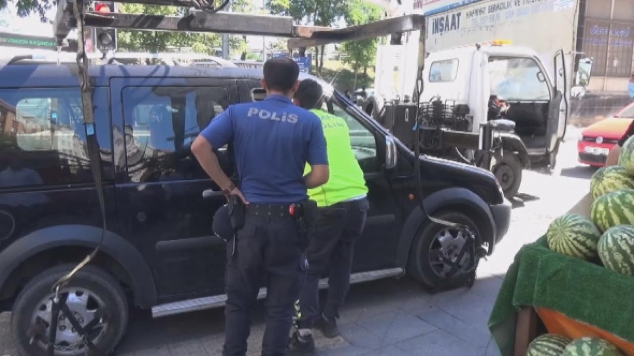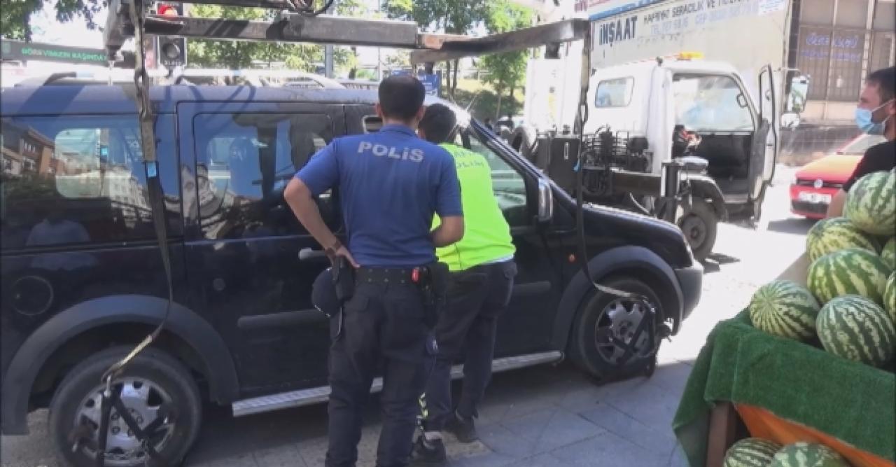 Silivri'de muayenesi olmayan aracını yasak alana park eden bir sürücü, aracı otoparka çekmek isteyen polislere zor anlar yaşattı.