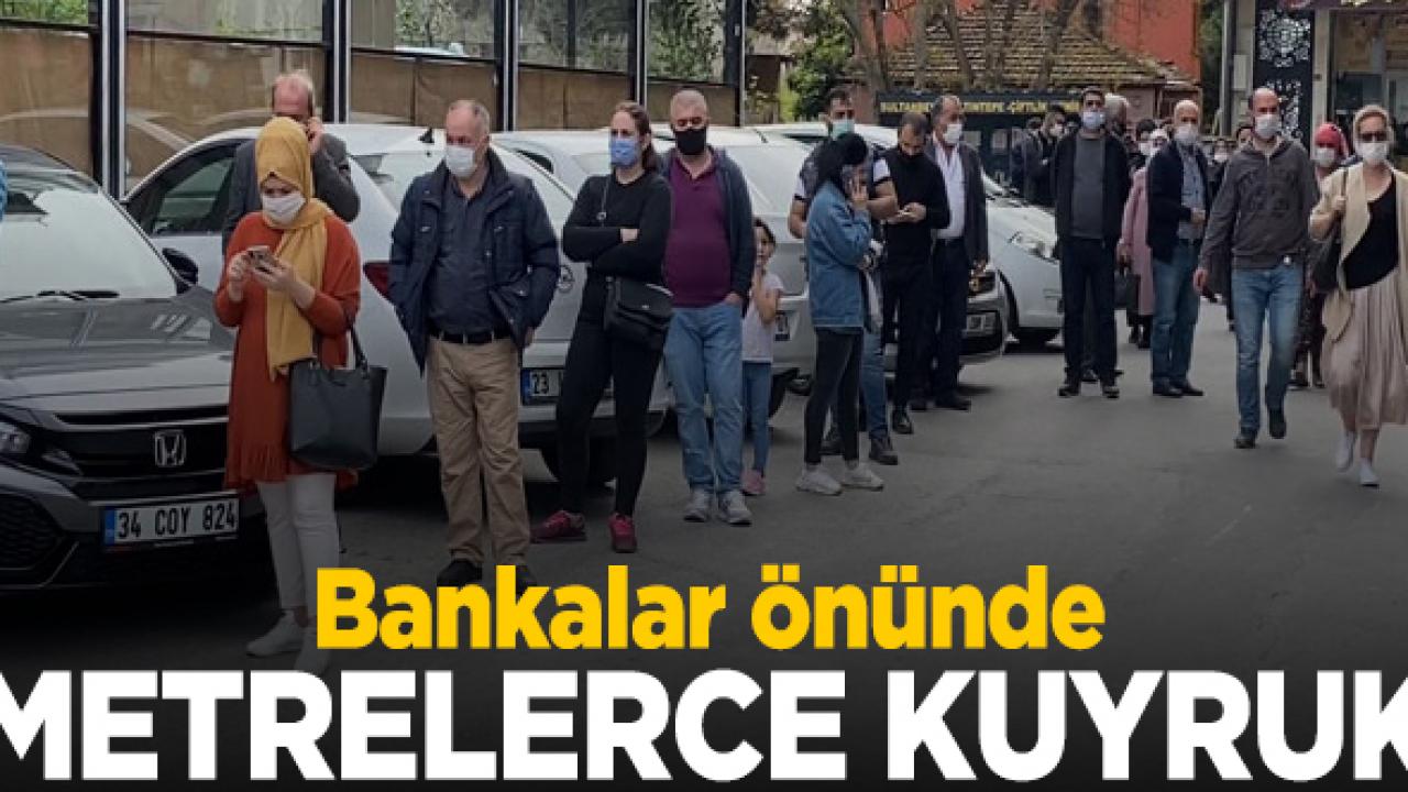 İstanbul Sultanbeyli'de banka önünde bekleyen vatandaşlar metrelerce kuyruk oluşturdu. Sosyal mesafeye özen gösterilse de bazı noktalarda hiçe sayıldığı görüldü.