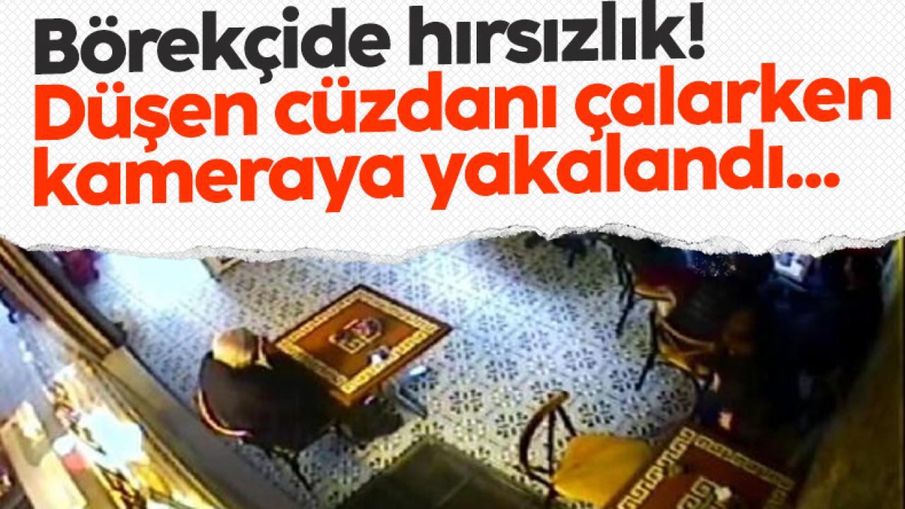 Sultangazi 50. Yıl Mahallesi'nde 28 Ocak Cumartesi günü börek salonunda arkadaşıyla buluşan kişi, bir süre sohbet etti. Bu sırada börek salonuna gelen bir başka müşteri siparişini verdikten sonra masaya oturdu. Kısa süre sonra ise yan masada oturanlar kalktı. Müşterilerden biri kalktığı sırada cüzdanını düşürdü. Yan masada börek siparişi verdikten sonra bekleyen kişi, düşen cüzdanı fark edip harekete geçti. Oturduğu masadan kalkarak yan masaya oturan şüpheli, yerdeki cüzdanı alarak bacak arasına sakladı. Cüzdanını düşüren kişi ile arkadaşı börekçiden ayrılırken, şüpheli siparişini bekledi. Börek siparişi gelen şüphelinin daha sonra iş yerinden ayrıldığı öğrenildi.