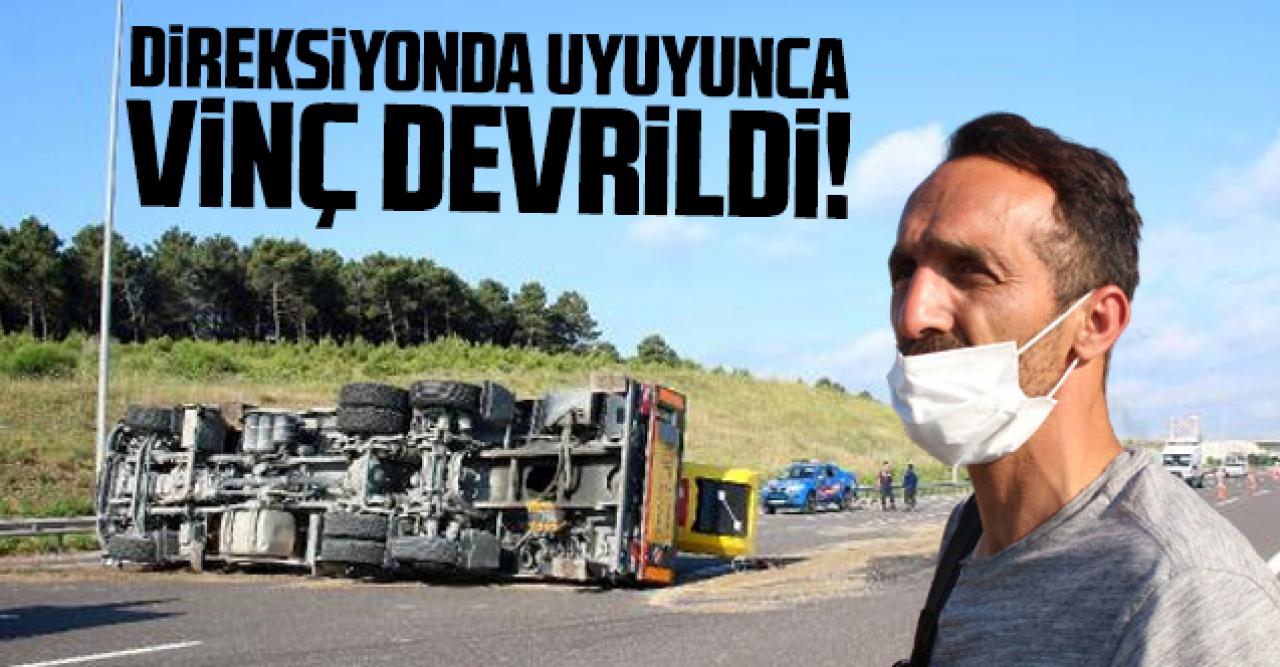 Kuzey Marmara Otoyolu'nda, sürücüsünün direksiyon başında uyuduğu vinç, bariyeri parçalayarak devrildi. Vinç, yaklaşık 20 metre sürüklendikten sonra durabilirken, sürücü kazayı hafif sıyrıklarla atlattı. Kaza nedeniyle, Ankara yönünde 3 şerit trafiğe kapatılırken, araç geçişi tek şeritten sağlandı.