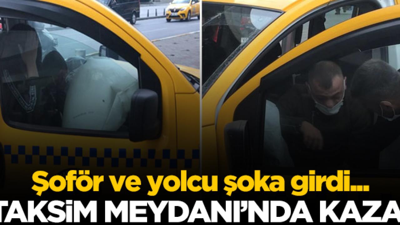 Taksim Meydanı'nda kaza yapan taksinin sürücüsü ve ön koltukta oturan turist kadın hava yastığının patlayıp yüzlerine çarpması sonucu şoka girdi. Kazadan birkaç saniye önce çekilen kazazedelerin yaşadığı zor anlar kameraya yansıdı.