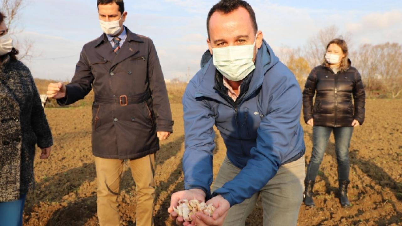 Daha önce lavanta, ceviz, zeytin ve tıbbı-aromatik bitki dikimi yapan Büyükçekmece Belediyesi Tarımsal Hizmetler Müdürlüğü, bu kez de sarımsak dikimi yaptı. Yerli sarımsak dikimi yapan belediye ekipleri elde edilecek hasadı tarımla uğraşan ve sarımsak yetiştirmek isteyen vatandaşlara dağıtacak. Özellikle içinde bulunulan Covid-19 salgınında bağışıklık güçlendirici tarım ürünleri arasında önemli bir yere sahip olan sarımsak ve soğan üretimine önümüzdeki günlerde de devam edilecek. Büyükçekmece Belediyesi’nin tarım için belirlenen arazisinde gerçekleştirilen yerli sarımsak dikim etkinliğine Belediye Meclis Üyesi Murat Erçağ ve Belediye Başkan Yardımcısı Dr. Rıza Evren Kılcı’da katıldı.
