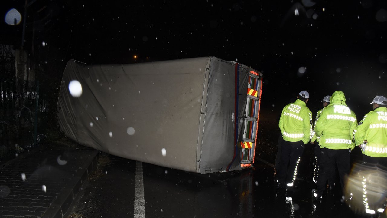 Edinilen bilgiye göre, Yakup Tonbul(64)'un kullandığı tekstil ürünleri yüklü 34 GBP 20 plakalı kamyon şoförünün, kayganlaşan yolda direksiyon hakimiyetini kaybetmesi nedeniyle kontrolden çıkarak devrildi. Kazada Tonbul, direksiyon ile koltuk arasında sıkıştı. İhbar üzerine olay yerine itfaiye, polis ve sağlık ekipleri sevk edildi. Tonbul, olay yerine sevk edilen itfaiye ekipleri tarafından sıkıştığı yerden çıkarıldı. İlk müdahalesi sağlık ekipleri tarafından olay yerinde yapılan Tonbul, ambulansla hastaneye kaldırıldı. Kazayı duyarak olay yerine gelen Tonbul'un iş arkadaşları, kamyondaki tekstil ürünlerini boşaltarak başka kamyona yükledi.