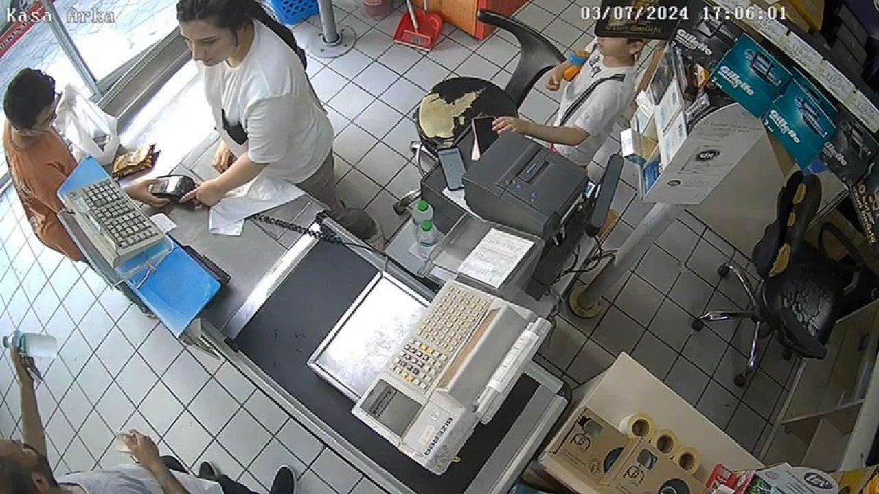 Şüpheli adam ise o sırada kasiyeri oyaladı. Çocuk ve adam daha sonra art arda marketten çıkarak hızla olay yerinden uzaklaştı. Hırsızlık anları ise güvenlik kamerasına yansıdı.