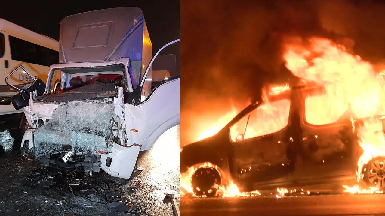 DHA- Bağcılar TEM Otoyolu'nda seyir halindeki hafif ticari araçta yangın çıktı. Alevlere itfaiye ekipleri müdahale ederken karşı şeritte ise kamyonet, yavaşlayan başka bir kamyonete çarptı. Kazada kamyonet içerisinde sıkışarak yaralanan 3 kişiye itfaiye müdahale etti.