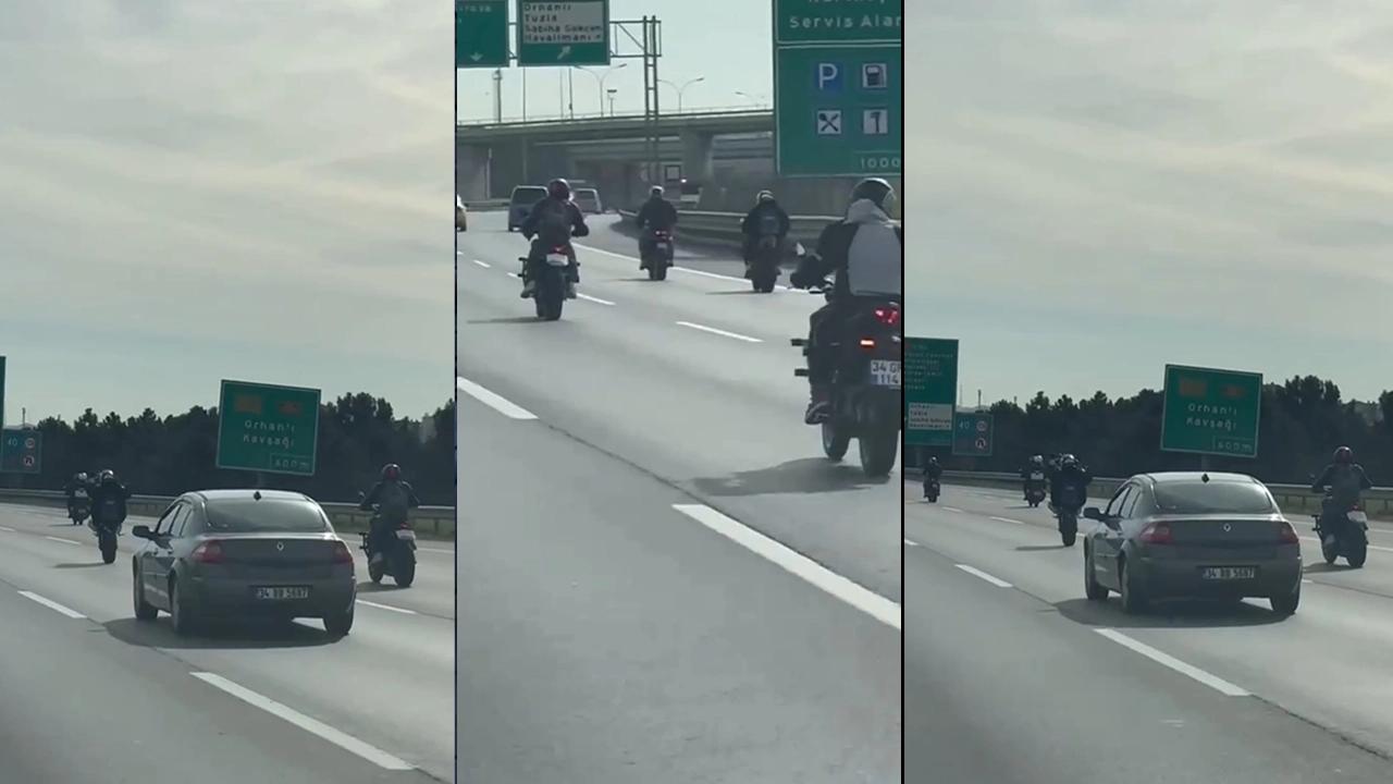 Pendik TEM Otoyolu'nda motosikletli bir grup uzun süre tek tekerlek üzerinde ilerledi. Trafikteki tehlikeli anlar, cep telefonu kamerasına yansıdı.