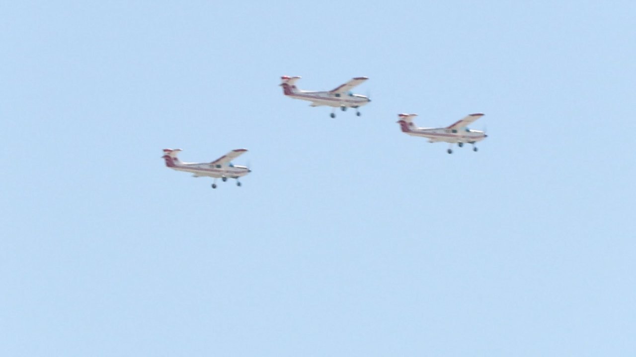 Türk Hava Kuvvetleri envanterinde bulunan F-16, F-4 ve Süper Mushshak uçakları, 111. Filo, 126. Filo ve 193 Filo ekipleri tarafından kol düzeninde alçak uçuş gösterisi yaptı. Uçuş ekibinin lideri 111. Filo Komutanı Hava Pilot Albay Rahmi Akgün, uçuş esnasında telsizden selam gönderdi.