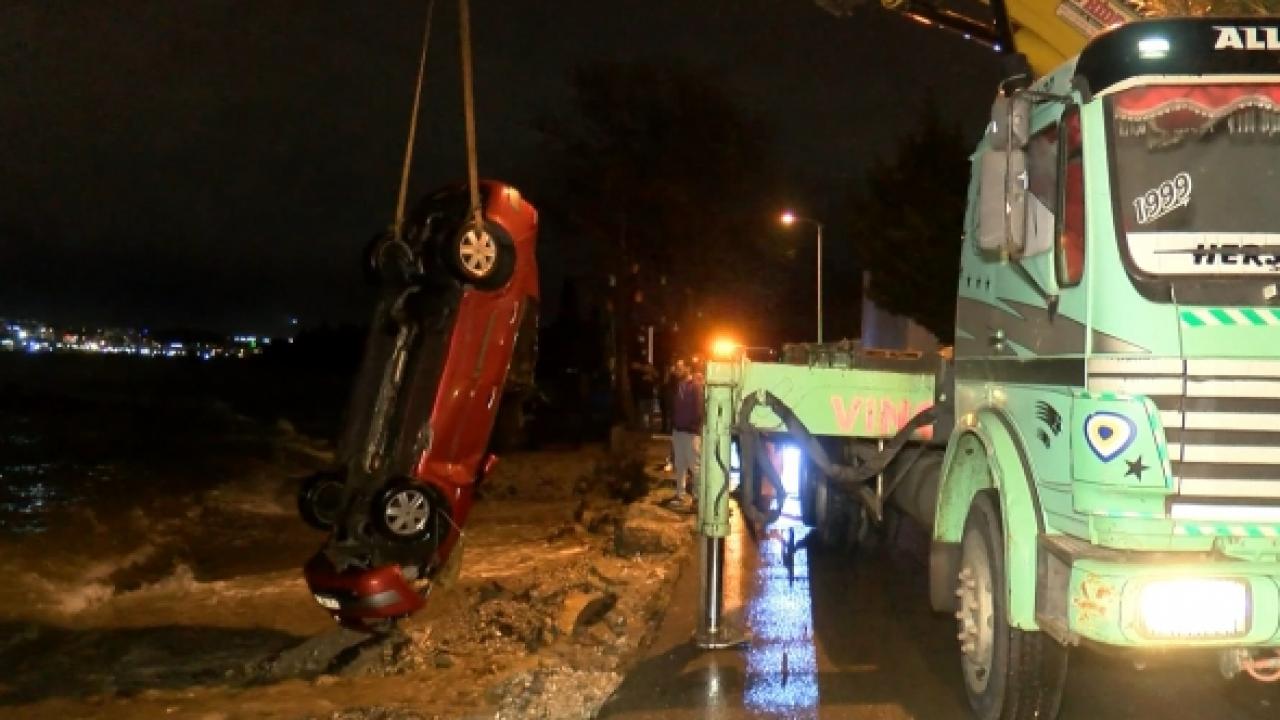 Otomobil olay yerine gelen ekip tarafından vinç yardımıyla denizden çıkarıldı.