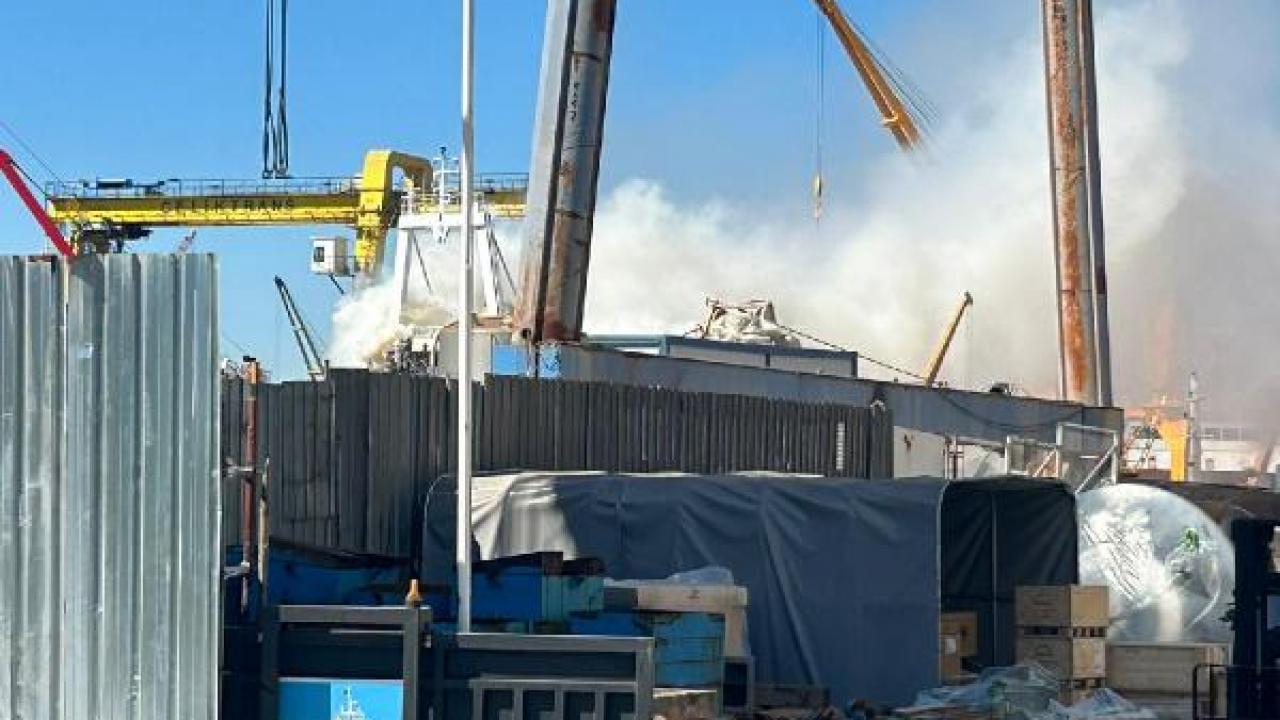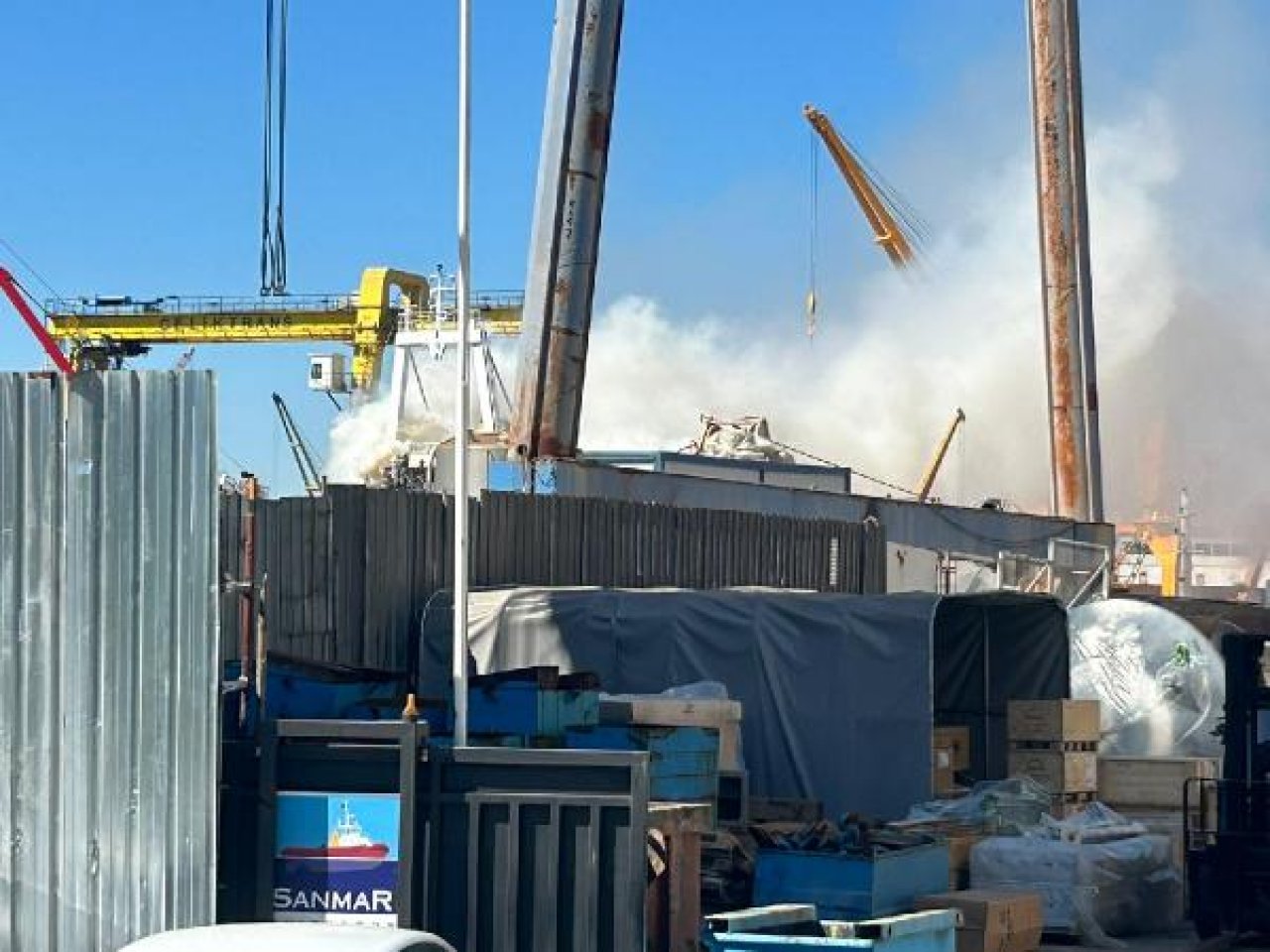 DHA - Tersaneye demirli kuru yük gemisinde çıkan yangına itfaiye ekipleri müdahale ediyor.