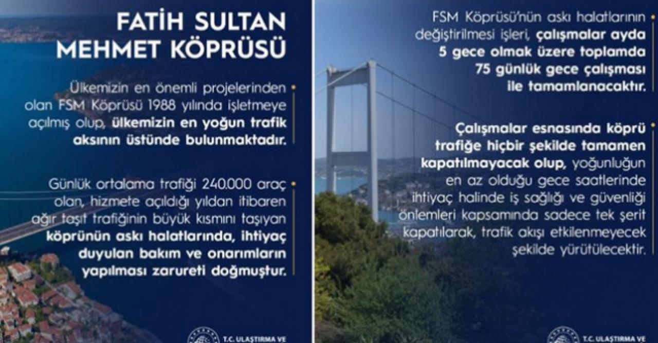 Bakanlığın Twitter hesabından yapılan açıklamada, Türkiye'nin en önemli projelerinden olan FSM Köprüsü'nün 1988 yılında işletmeye açıldığı ve ülkenin en yoğun trafik aksının üstünde bulunduğu hatırlatılarak, "Günlük ortalama trafiği 240 bin araç olan, hizmete açıldığı yıldan itibaren ağır taşıt trafiğinin büyük kısmını taşıyan köprünün askı halatlarında, ihtiyaç duyulan bakım ve onarımların yapılması zarureti doğmuştur. FSM Köprüsü'nün askı halatlarının değiştirilmesi işleri, çalışmalar ayda 5 gece olmak üzere toplamda 75 günlük gece çalışmasıyla tamamlanacaktır. Çalışmalar esnasında köprü trafiğe hiçbir şekilde tamamen kapatılmayacak olup, yoğunluğun en az olduğu gece saatlerinde ihtiyaç halinde iş sağlığı ve güvenliği önlemleri kapsamında sadece tek şerit kapatılarak, trafik akışı etkilenmeyecek şekilde yürütülecektir" denildi.