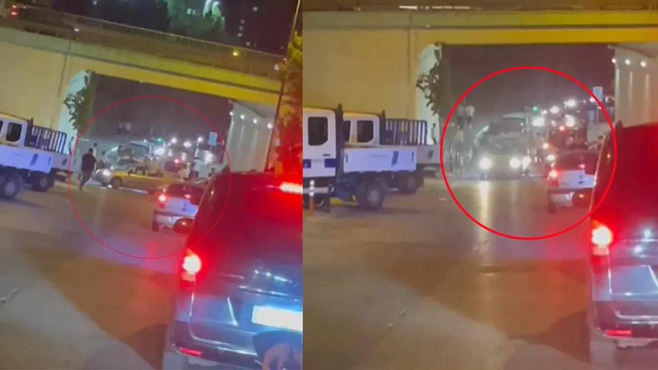Ellerinde Türk bayraklarıyla yolu kapatan şahıslar, trafikte yoğun araç kuyruğunun oluşmasına neden olurken, o anlar ise cep telefonu kamerasına saniye saniye yansıdı.