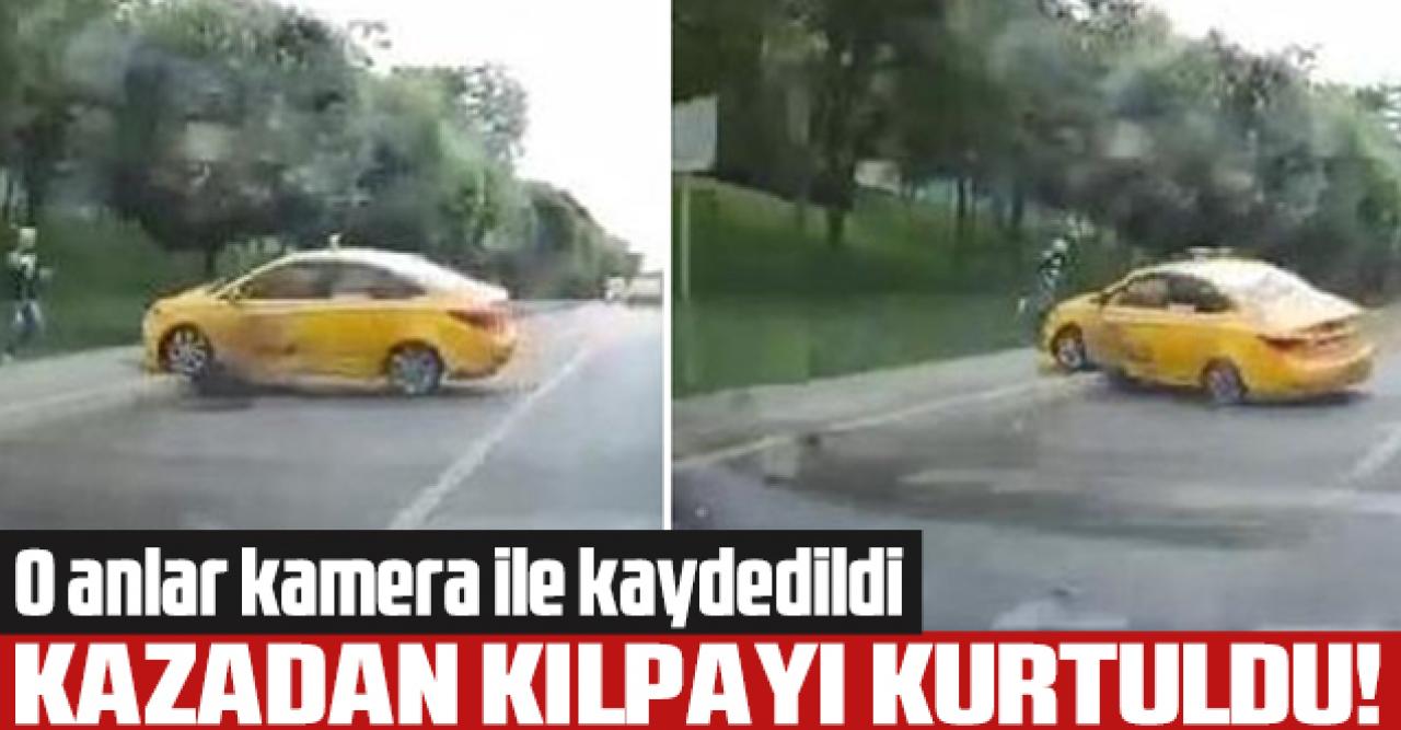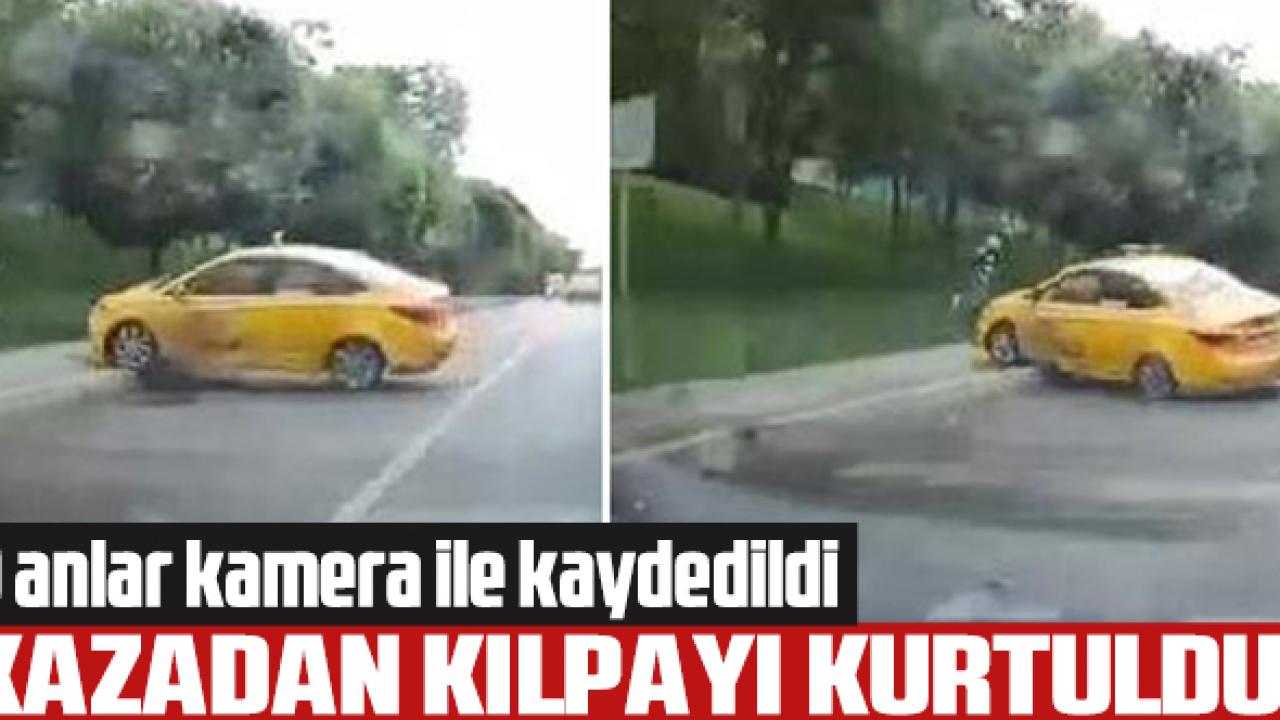 Ümraniye'de, yağmur nedeniyle kayganlaşan yolda sürücüsünün fren yaptığı taksi kaldırıma çarptıktan sonra ters döndü. Kaldırımdaki yaya kazadan kıl payı kurtuldu. Kaza anı araç kamerasına yansıdı.