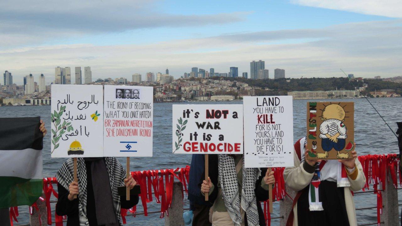 Slices of Resistance Topluluğu ve Yetim Vakfı üyeleri İsrail'in Gazze'ye yönelik salıdırlarını protesto etmek amacıyla Cuma namazı çıkışında eylem yaptı. Oxford ve Saraybosna'da da eş zamanlı olarak "Susturulan her ses için harekete geç" sloganıyla yapılan protestoda Üsküdar'da ölenlerin isimlerinin yazılı olduğu kırmızı kurdeleler sahildeki demir korkuluklara bağlandı. Grup adına konuşan Zeynep Dinler, "75 yıldır devam eden 7 Ekim tarihinde de yoğunlaşan ve aralıksız süren işgalci İsrail'in katliamları neticesinde birçok masum sivil hayatını kaybetmiştir. Hastaneler, ibadethaneler bombalanarak kullanılamaz hale getirilerek ikinci Nekbe yaşatılmaktadır. Şu anda kayıtlara geçen verilere göre en az 11 bin 500 sivil hayatını kaybetmiştir. Bunun 4 bin 600'ü çocuklardan oluşmaktadır" dedi.