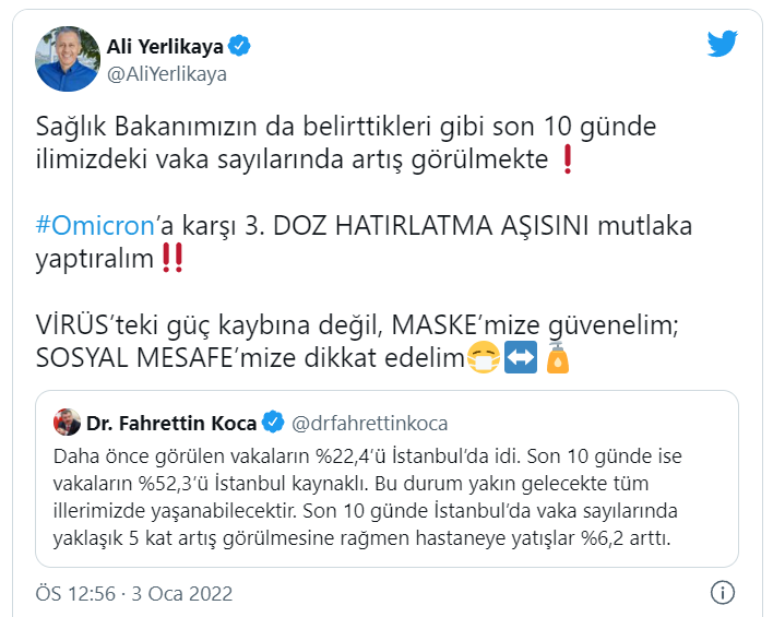İstanbul Valisi Ali Yerlikaya, son 10 günde kentte koronavirüs vakalarında artış görüldüğünü açıkladı. Yerlikaya, koronavirüsün yeni varyantı Omicran'a karşı 3. doz hatırlatma aşısının mutlaka yapılması gerektiği uyarısında bulundu.Yerlikaya, maske ve sosyal mesafeye dikkat edilmesi gerektiği hatırlatmasını da yaptı.Sosyal medya hesabından paylaşım yapan Yerlikaya, şunları söyledi: "Sağlık Bakanımızın da belirttikleri gibi son 10 günde ilimizdeki vaka sayılarında artış görülmekte. #Omicron’a karşı 3. doz hatırlatma aşısını mutlaka yaptıralım. Virüsteki güç kaybına değil, maskemize güvenelim; sosyal mesafemize dikkat edelim."