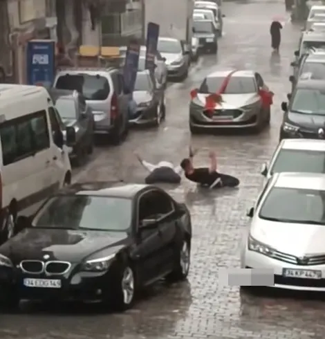 Esenyurt ilçesine bağlı İncirtepe mahallesinde gelin almaya gelen erkek tarafı, danslar ve müziklerle karşılandı. O anlarda sokaktaki 2 genç, yağmurun yağmasına aldırış etmeden sokak ortasında oynayarak hünerlerini sergiledi.