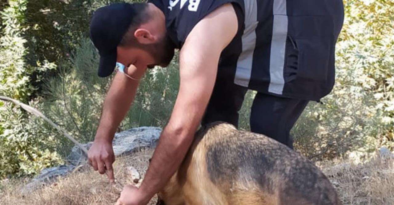 Öğlen yemeği için mola veren Yılmaz, bir köpeğinin yiyecek aradığını fark etti. Sofradan kalkan Yılmaz, konservesini köpekle paylaştı. Köpeğin yanan köyden yanlarına geldiğini belirten Yılmaz, “Köyde her yer yandığı için yiyecek bir şey bulamamıştı galiba. Yanımıza doğru geldiğini gördüm. O da bir can. Aç olmasına dayanamadım konservemi ona verdim. Daha sonra artan yiyeceklerden de yedi. Suyunu içtikten sonra gitti” dedi. Yılmaz’ın bu anları arkadaşları tarafından da cep telefonuyla görüntülendi.