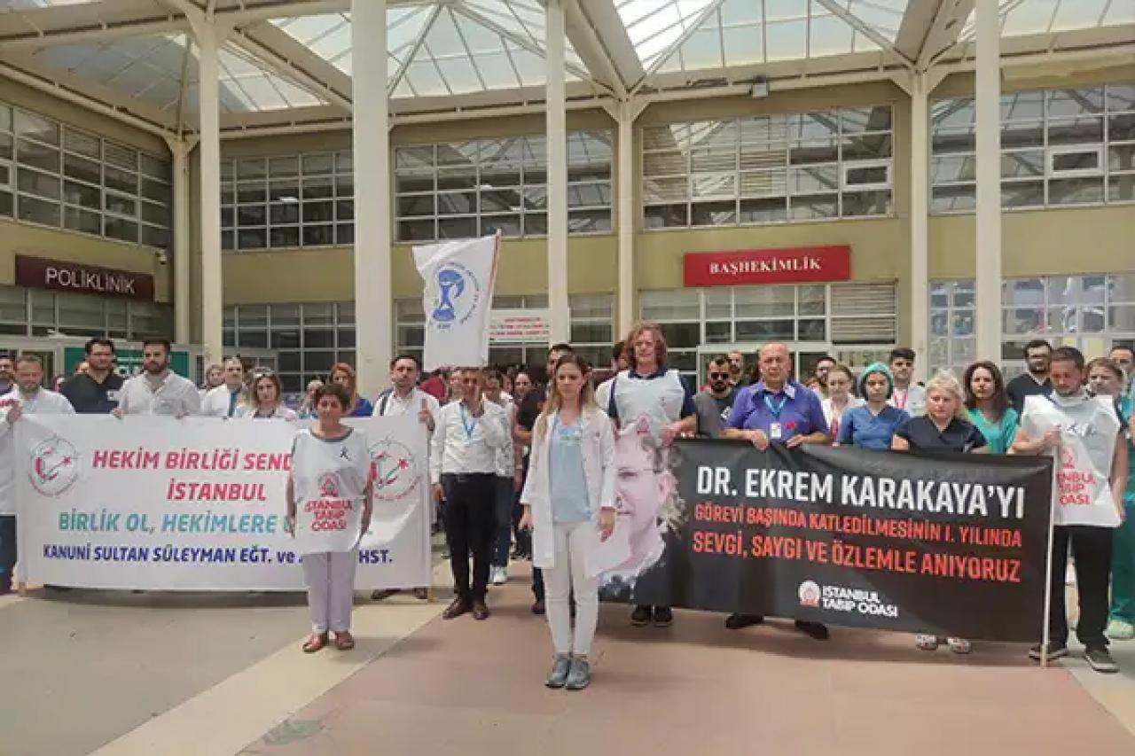 İstanbul’da doktorlar Kanuni Sultan Süleyman Eğitim Araştırma Hastanesi Başhekimliği önünde 12.30’da geçen sene bugün katledilen Doktor Ekrem Karakaya’yı anmak ve görevi başında şikâyet sonucu apar topar gözaltına alınan Suna Dilbaz’a destek vermek için basın açıklaması gerçekleştirdi. İstanbul Tabip Odası’nın (İTO) düzenlediği açıklamaya Sağlık ve Sosyal Hizmet Emekçileri Sendikası (SES) İstanbul Şube ve Hekim Birliği Sendikası’ndan da temsilciler katıldı.