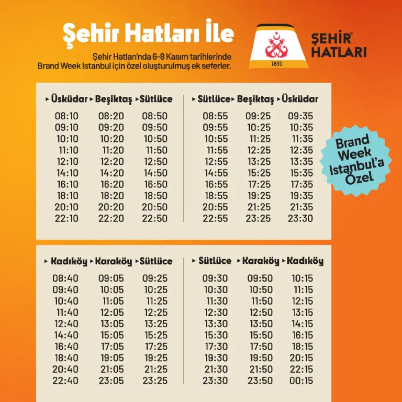 Şehir Hatları’nda sadece BWI için özel oluşturulmuş ek seferler ile 6 – 7 – 8 Kasım tarihleri boyunca Sütlüce İskelesi’ne ulaşarak etkinliğe giriş yapabilirsiniz.