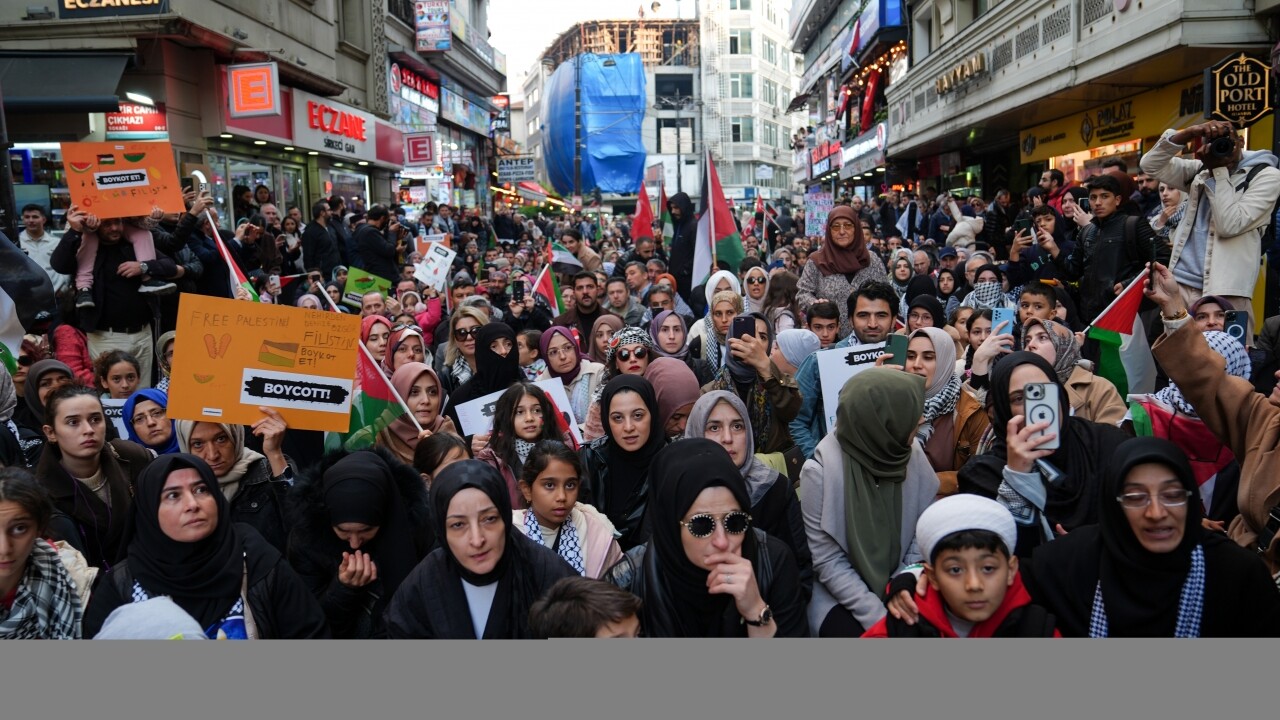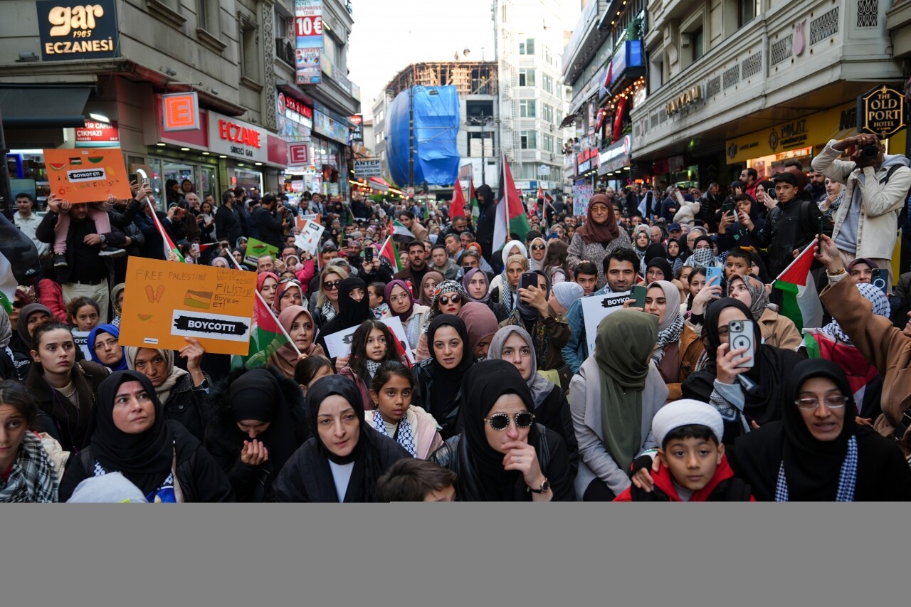 Türk ve Filistin bayrakları taşıyan kalabalık grup, Sultanahmet Meydanı’nda toplandı. Ellerindeki zilleri çalan gruptakiler, İsrail aleyhinde sloganlar eşliğinde yürüyüşe geçti.