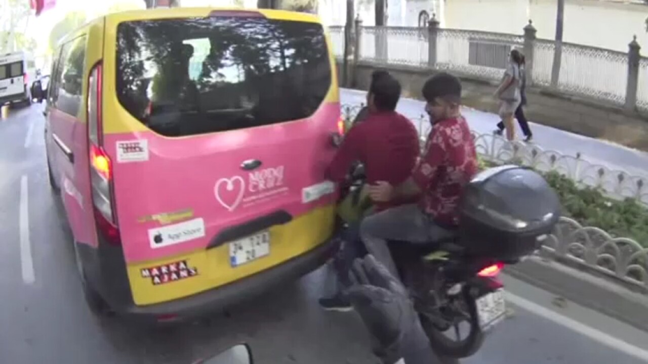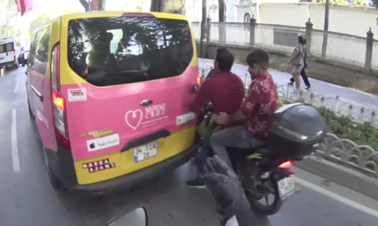 Olay, geçtiğimiz günlerde Beşiktaş Dolmabahçe’de meydana geldi. Yoğun trafikte araçların arasından geçen bir motosikletli, önüne aniden kıran minibüse sinirlendi. Bu sırada yan tarafta seyreden diğer bir motosikletli, sürücünün bu davranışını takip edip ona doğru kafasını çevirdi. Bir anda trafikte olduğunu unutan sürücü, diğer motosikletlinin “Dikkat et” diyerek bağırmasına rağmen, önündeki dolmuşa arkasında çarptı.