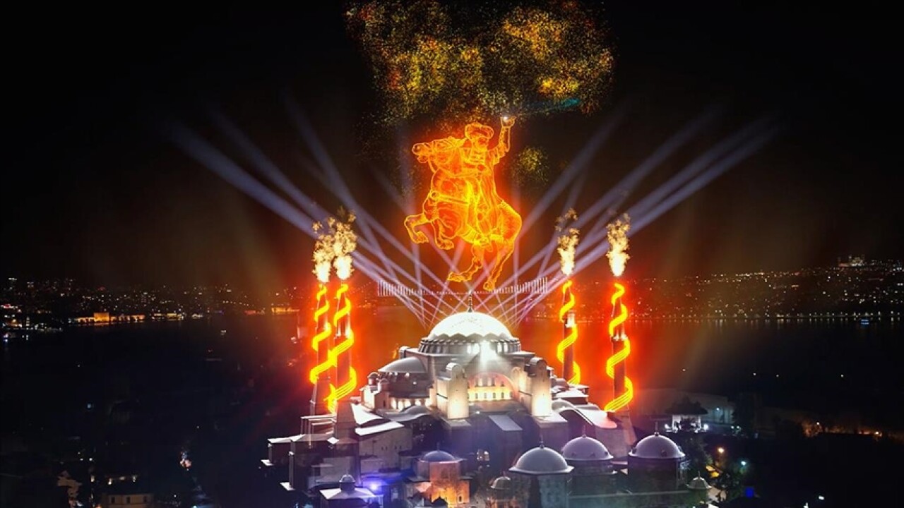Fethe dair bilgilerin de seslendirildiği coşkulu kutlamada, fethin sembolü Ayasofya'nın semasına Türkiye'de ilk kez uygulanan gökyüzü video haritalama yöntemiyle fetih görselleri yansıtıldı.