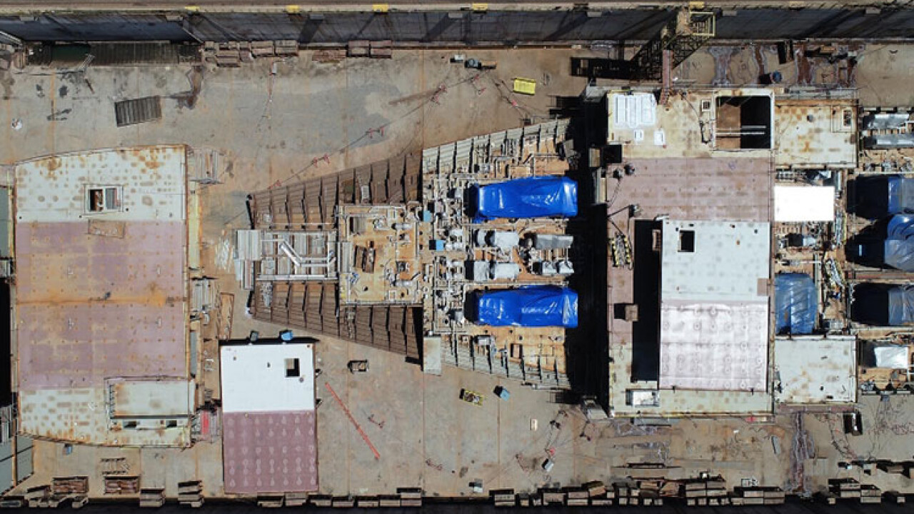 Türkiye’nin gururu olan ilk yerli savaş uçak gemisi Çok Maksatlı Amfibi Hücum Gemisi TCG L400 Anadolu’nun inşası Sedef Tersanesi’nde hızla devam ediyor. Geminin havuzda bloklarının yerleştirilmesi ve çalışmaları havadan görüntülendi.