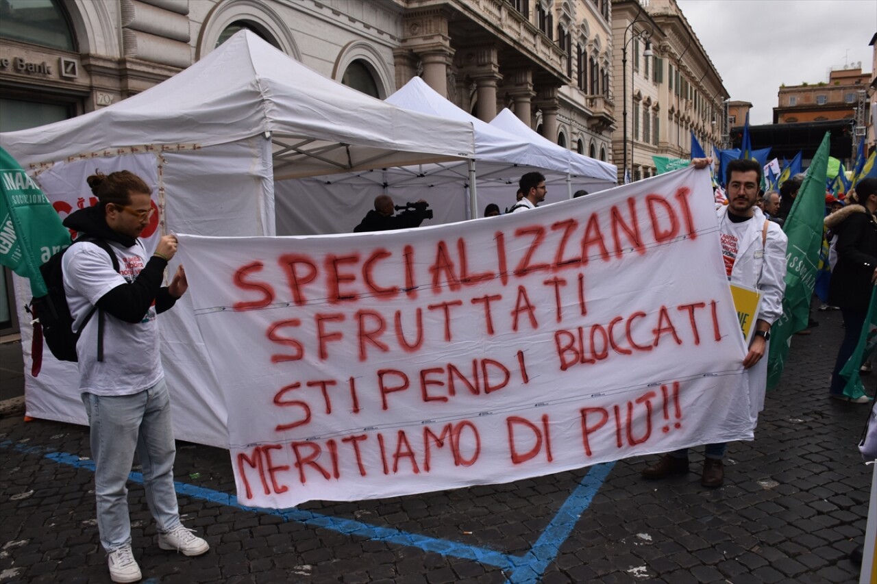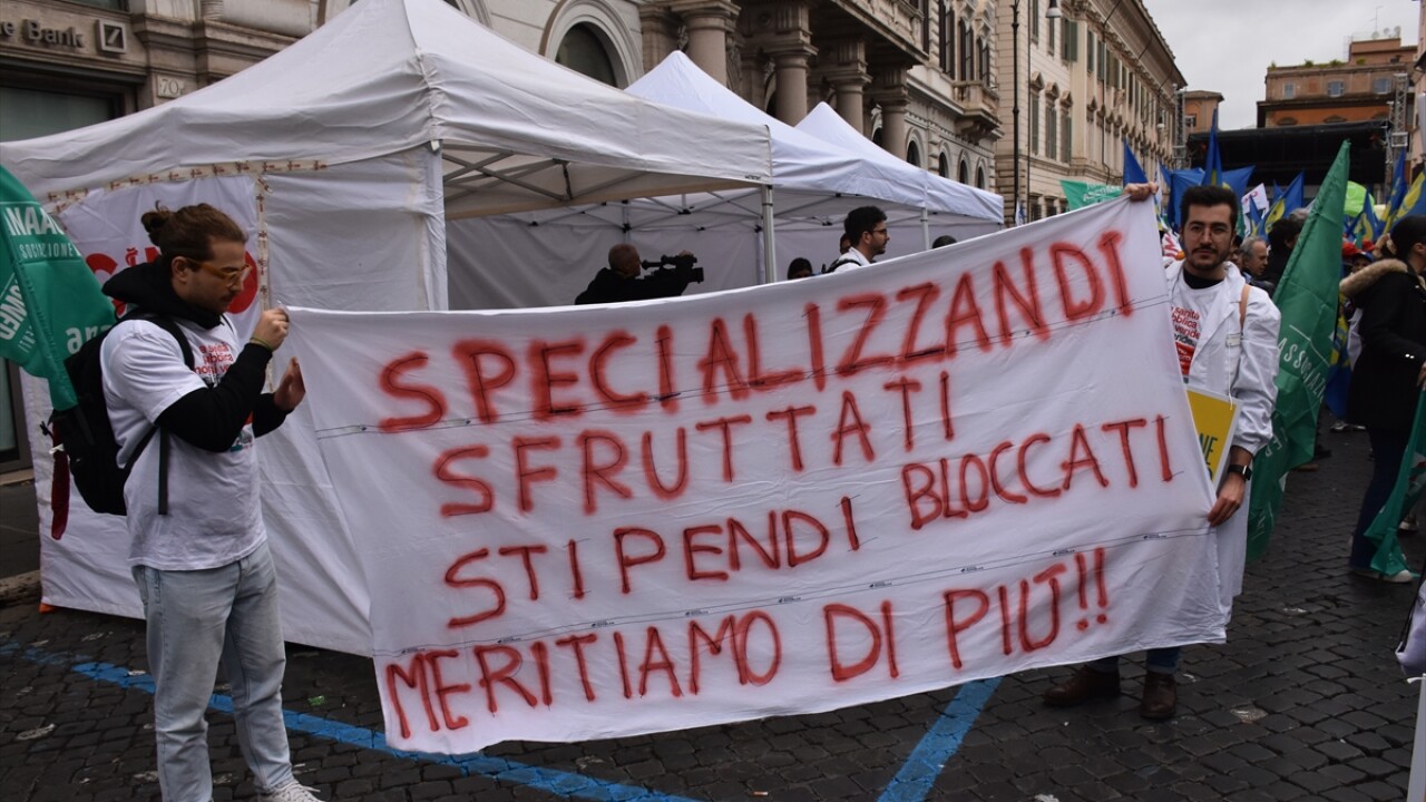 Hastanelerde sağlık personeline daha fazla saygı gösterilmesini talep eden gruptakiler, İtalyanca "saygı" yazılı dövizler taşıdı. Katılımcılar, kaynak yetersizliğine de tepki gösterdi.