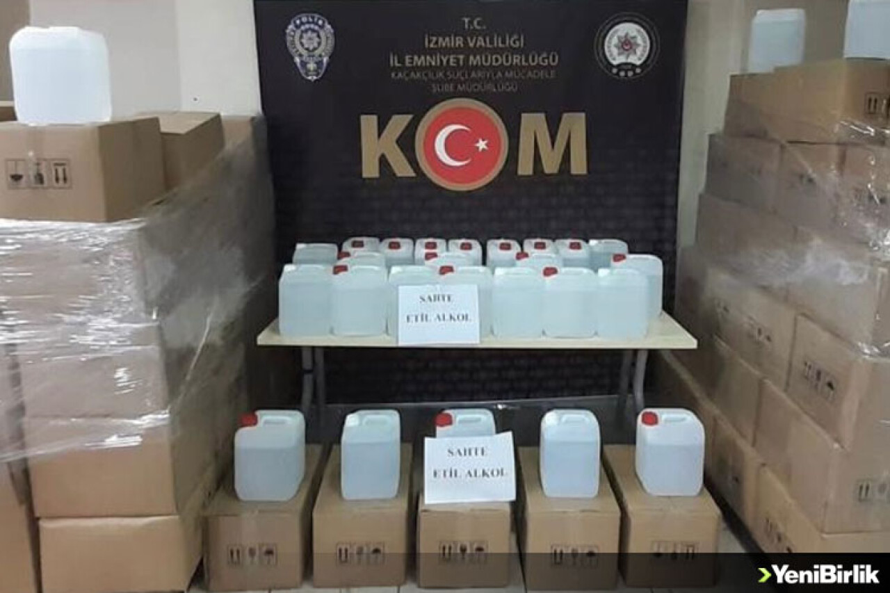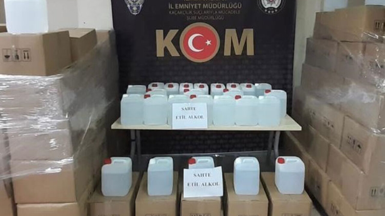 İzmir'de dezenfektan adı altında satışa sunulmak üzere ambalajlanmış 8 ton etil alkol ele geçirildi.