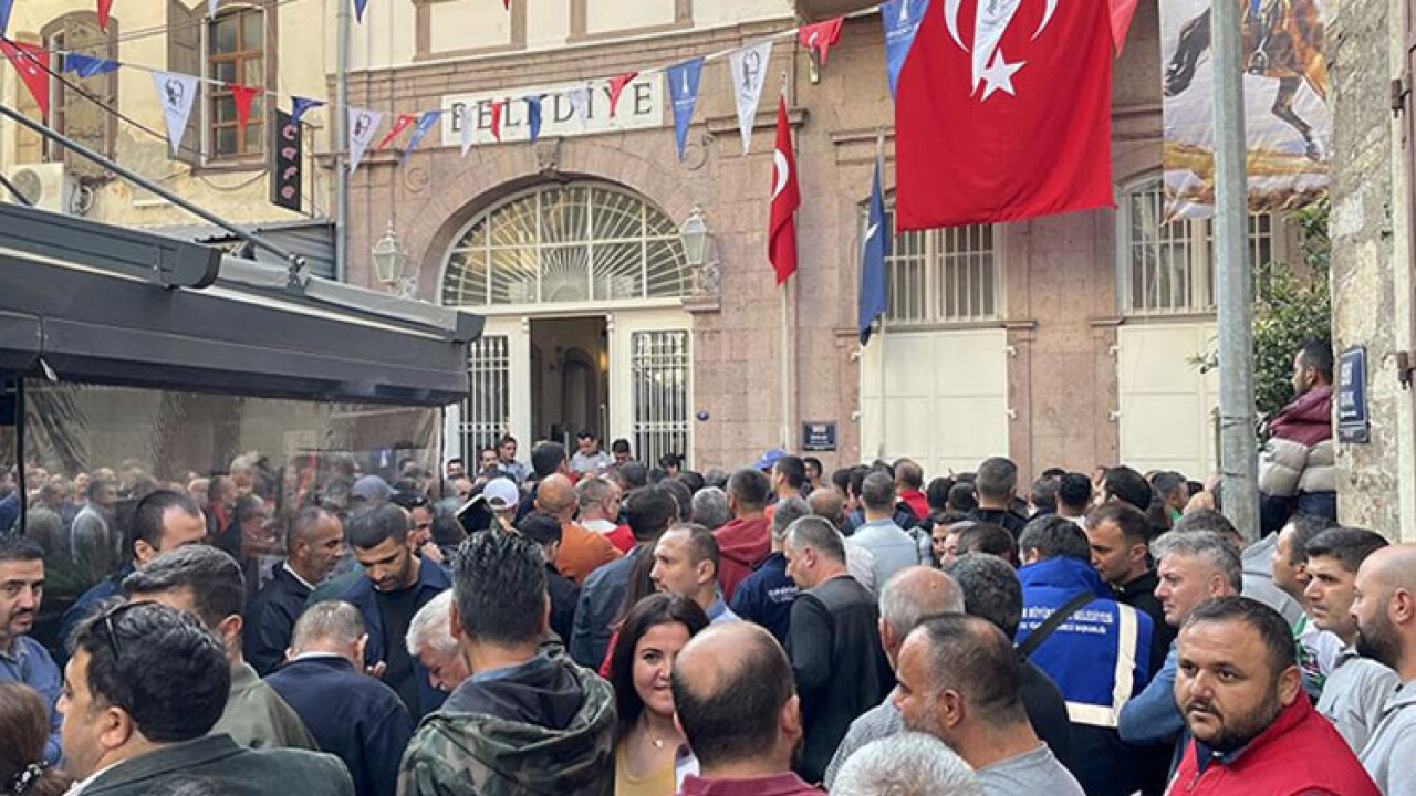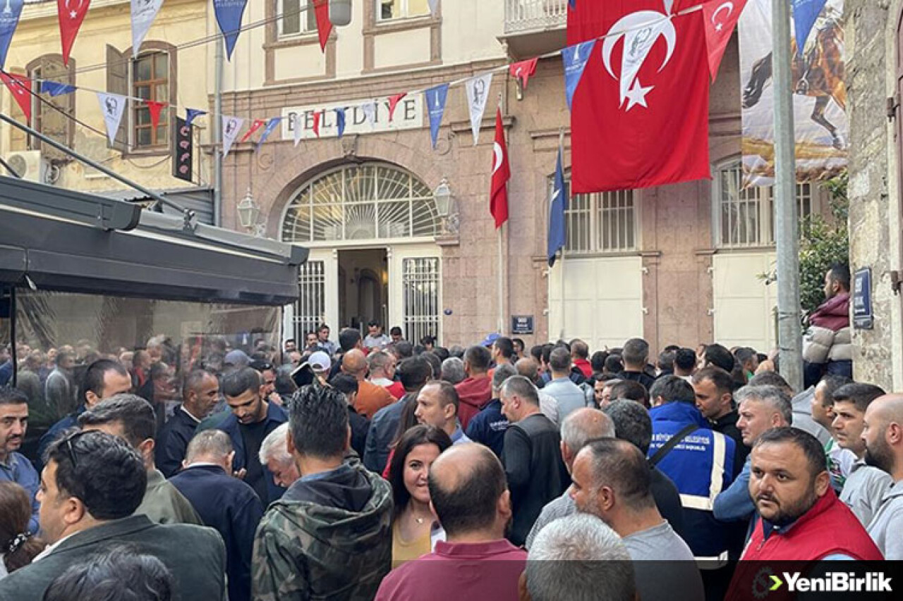 Kemeraltı Çarşısı'ndaki İzmir Büyükşehir Belediye binası önünde toplanan bir grup İZENERJİ çalışanı, iş bırakarak protesto eylemi yaptı.