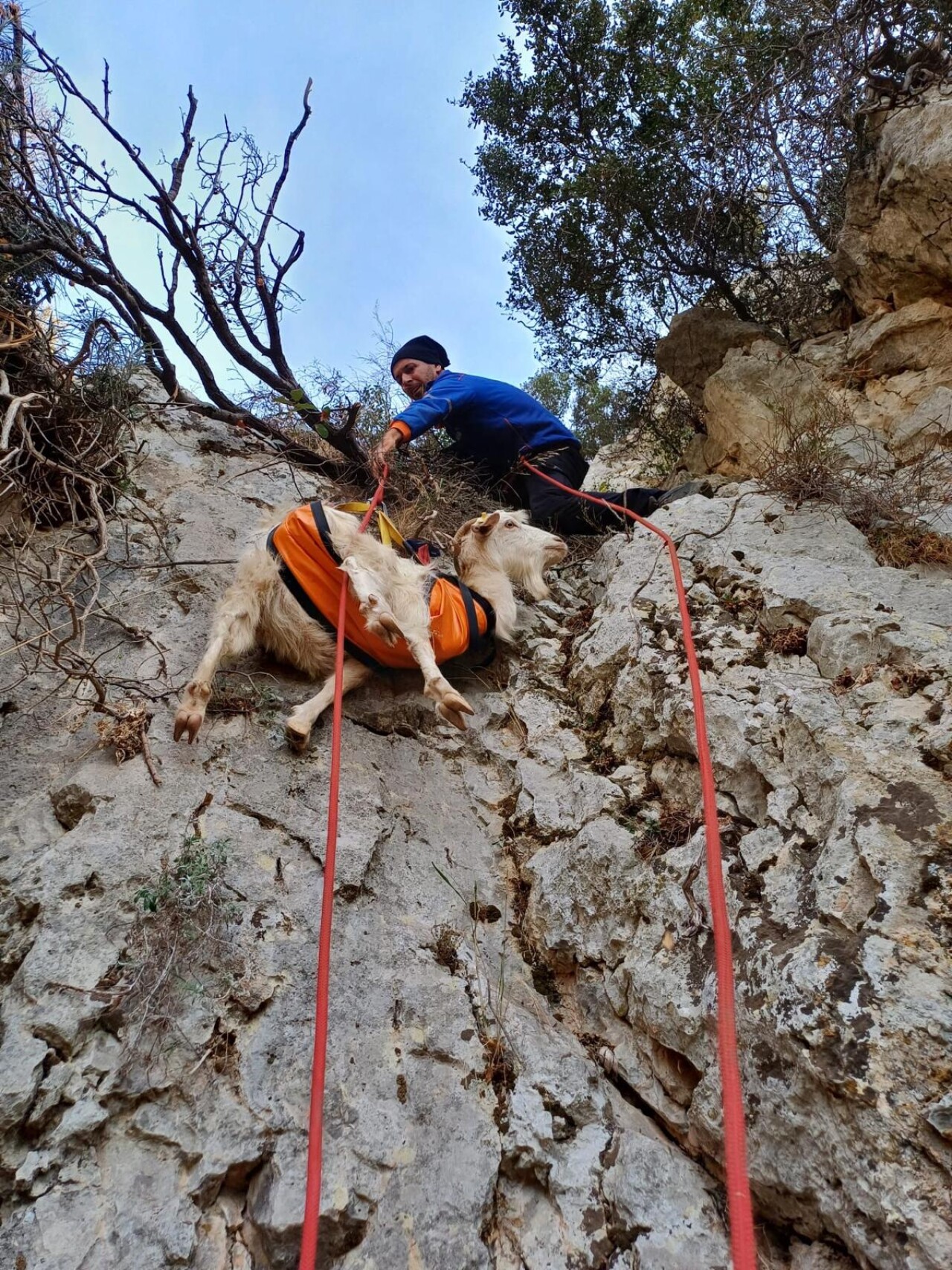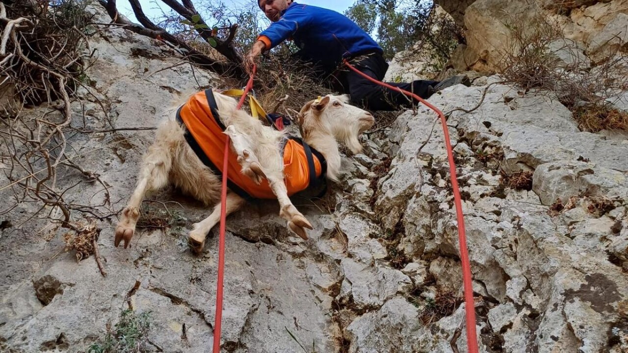 Dağcı ipleriyle yamaçta sistem kuran ekipler, keçinin mahsur kaldığı alana ulaştı.