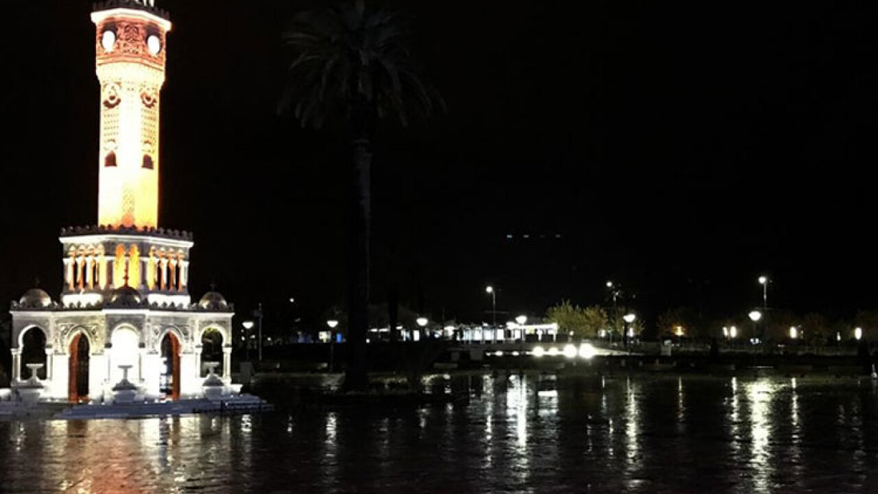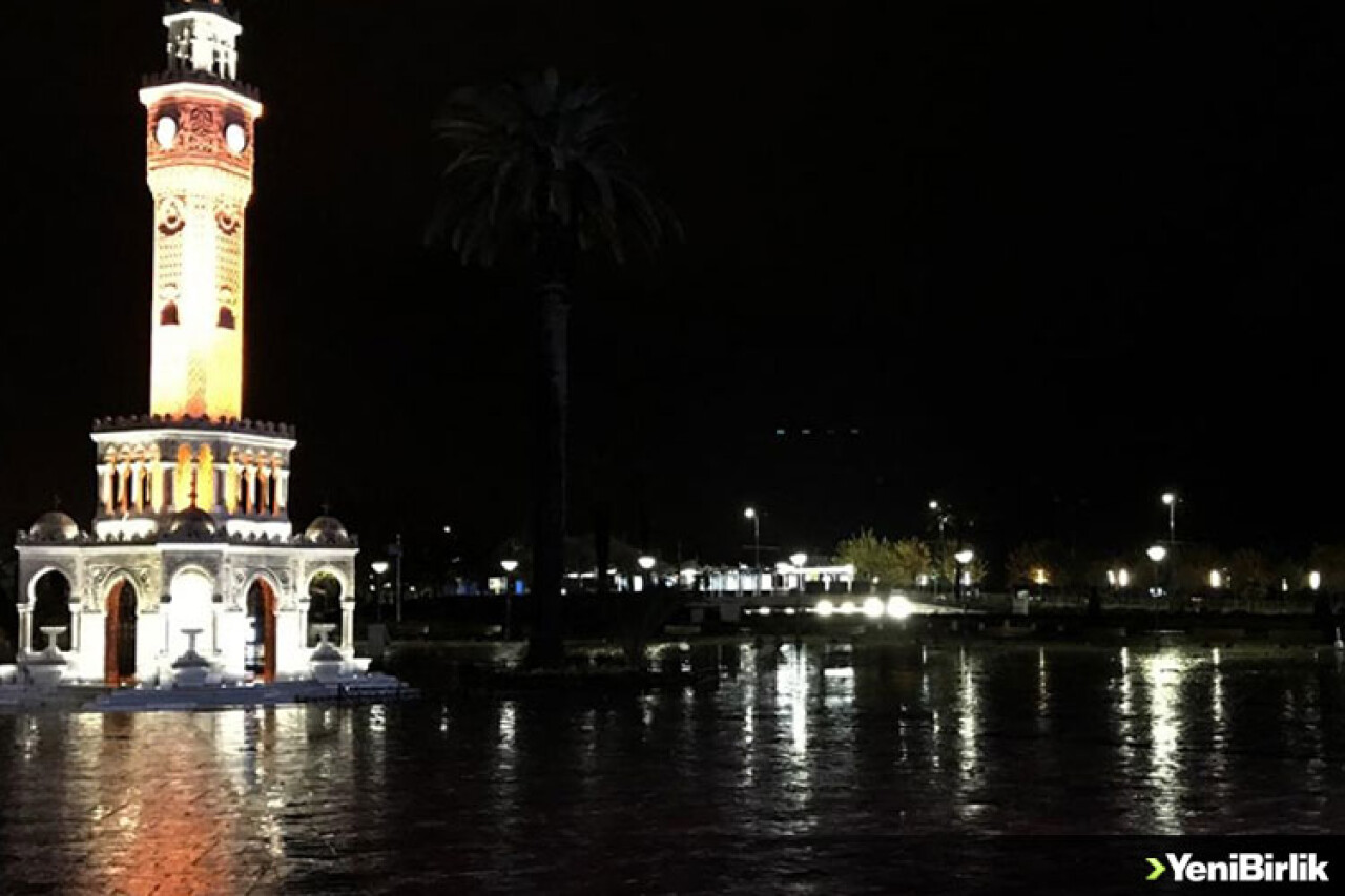 Kentin simgelerinde olan tarihi İzmir Saat Kulesi de rengarenk ışıklarıyla yağmurda güzel görseller oluşturdu.