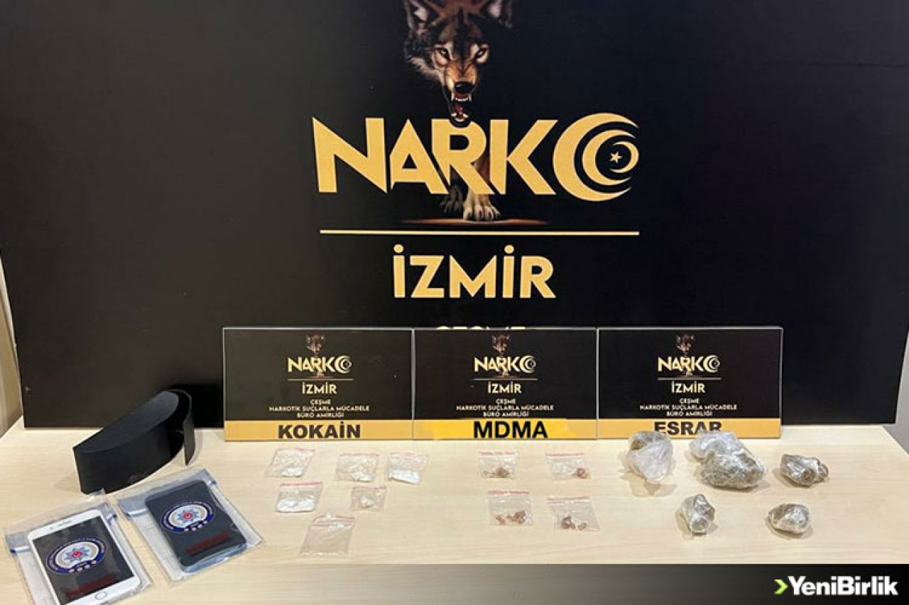 Alınan bilgiye göre, Çeşme'de bir araçta arama yapıldı. Araçta satışa hazır halde 46 gram esrar, 6 gram kokain, 5 gram sentetik uyuşturucu ele geçirildi.