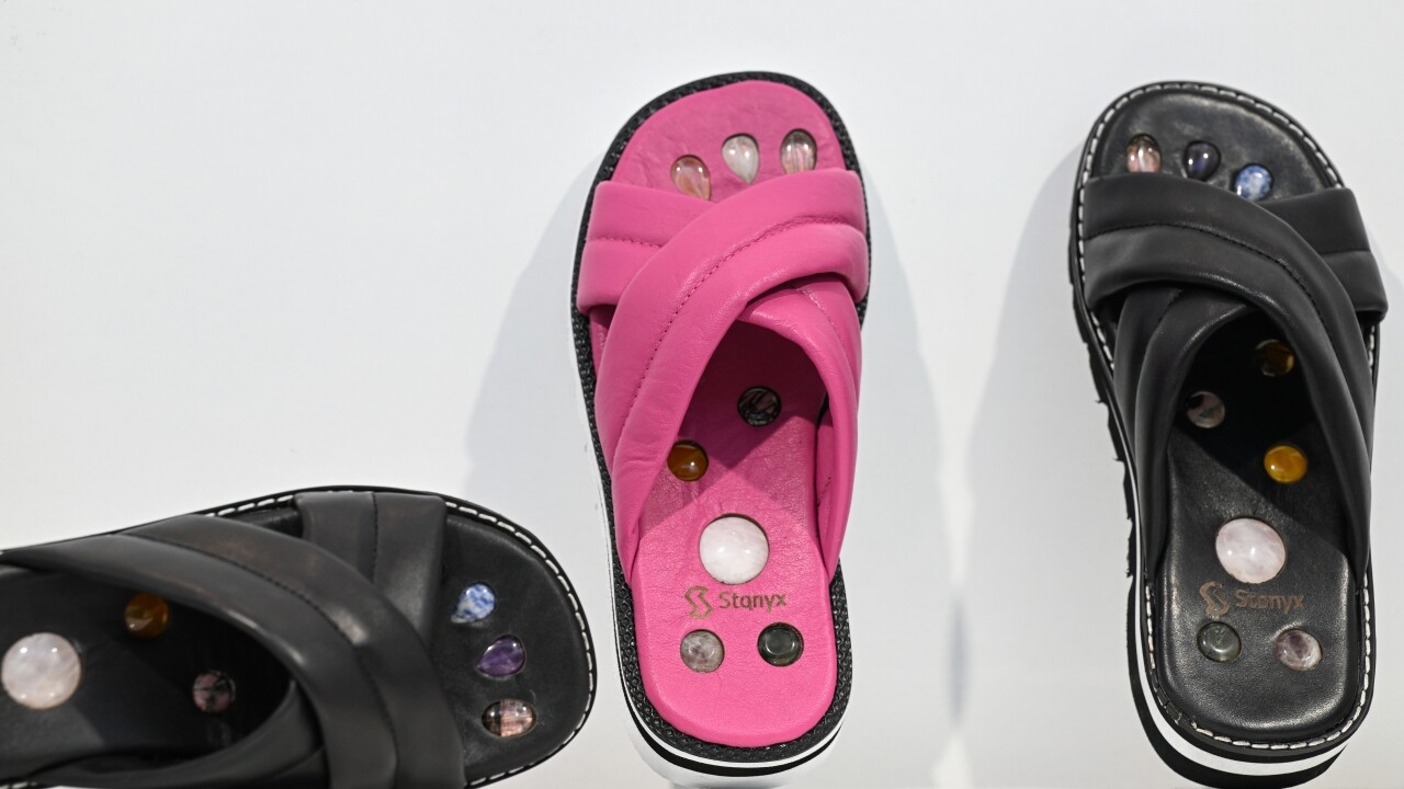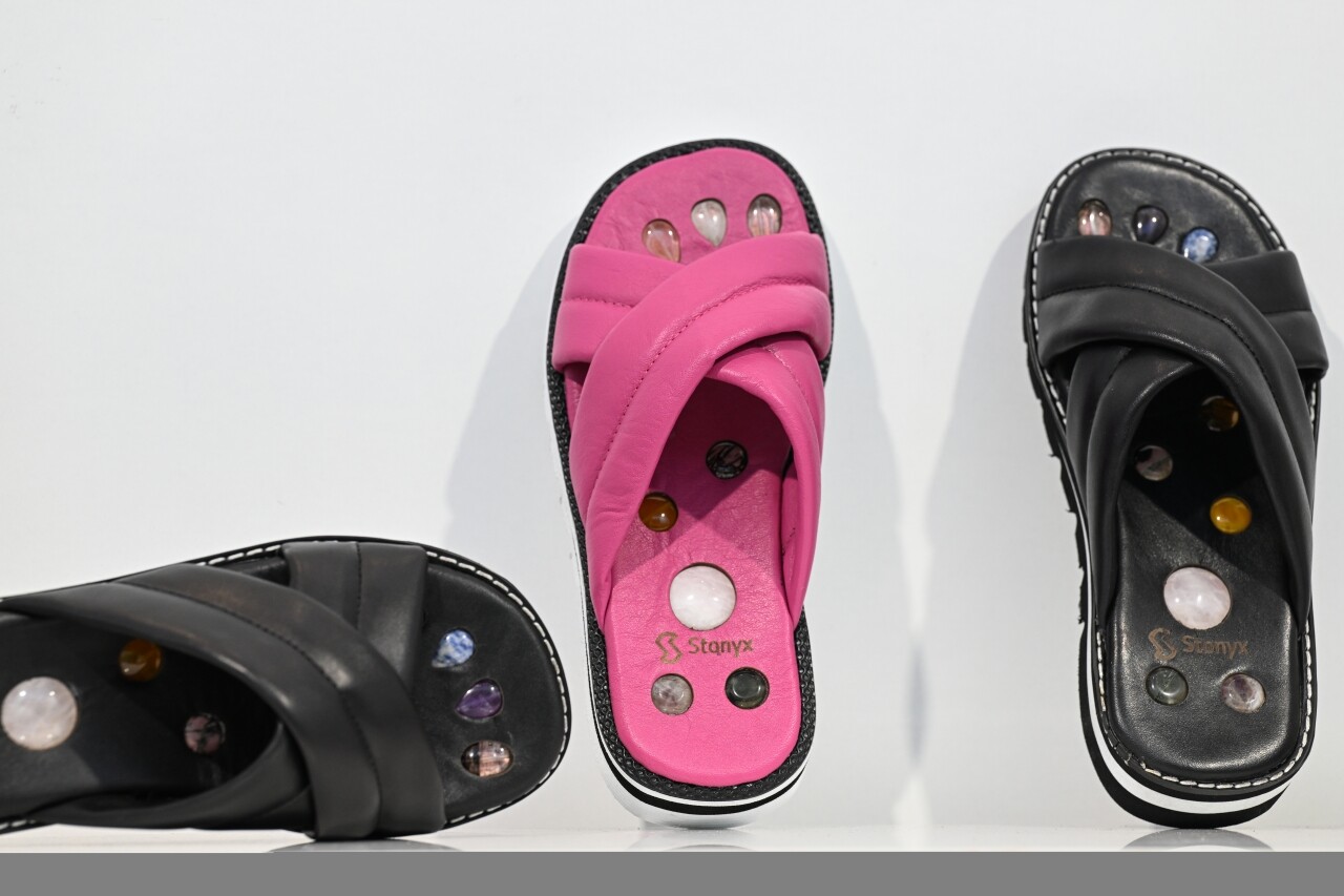 Gökçe'nin dumanlı kuvars, kaplan gözü, sitrin, aventurin, ametist, rodonit, kristal kuvars, jasper, akik gibi farklı taşlarla, farklı renk ve modelde tasarladığı terlik ile sandaletler, fuara katılan yabancı marka sahiplerinin ilgisini çekti.