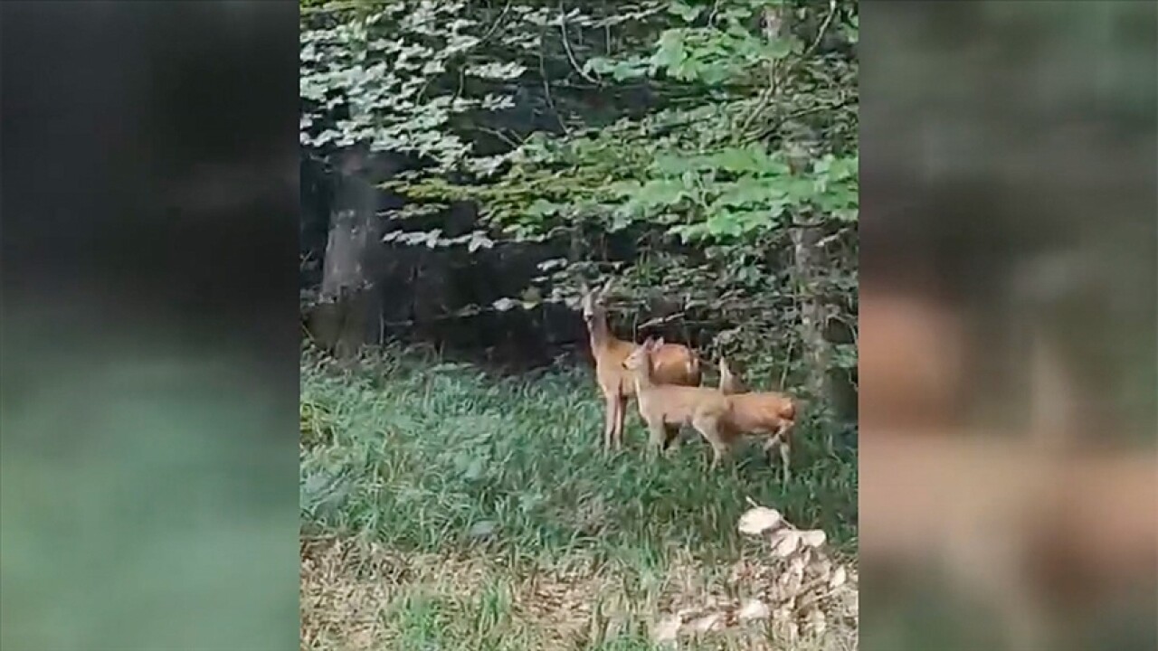 Görüntülerde, ormanlık alanda otlayan karaca ve yavrularının daha sonra uzaklaşması yer alıyor.
