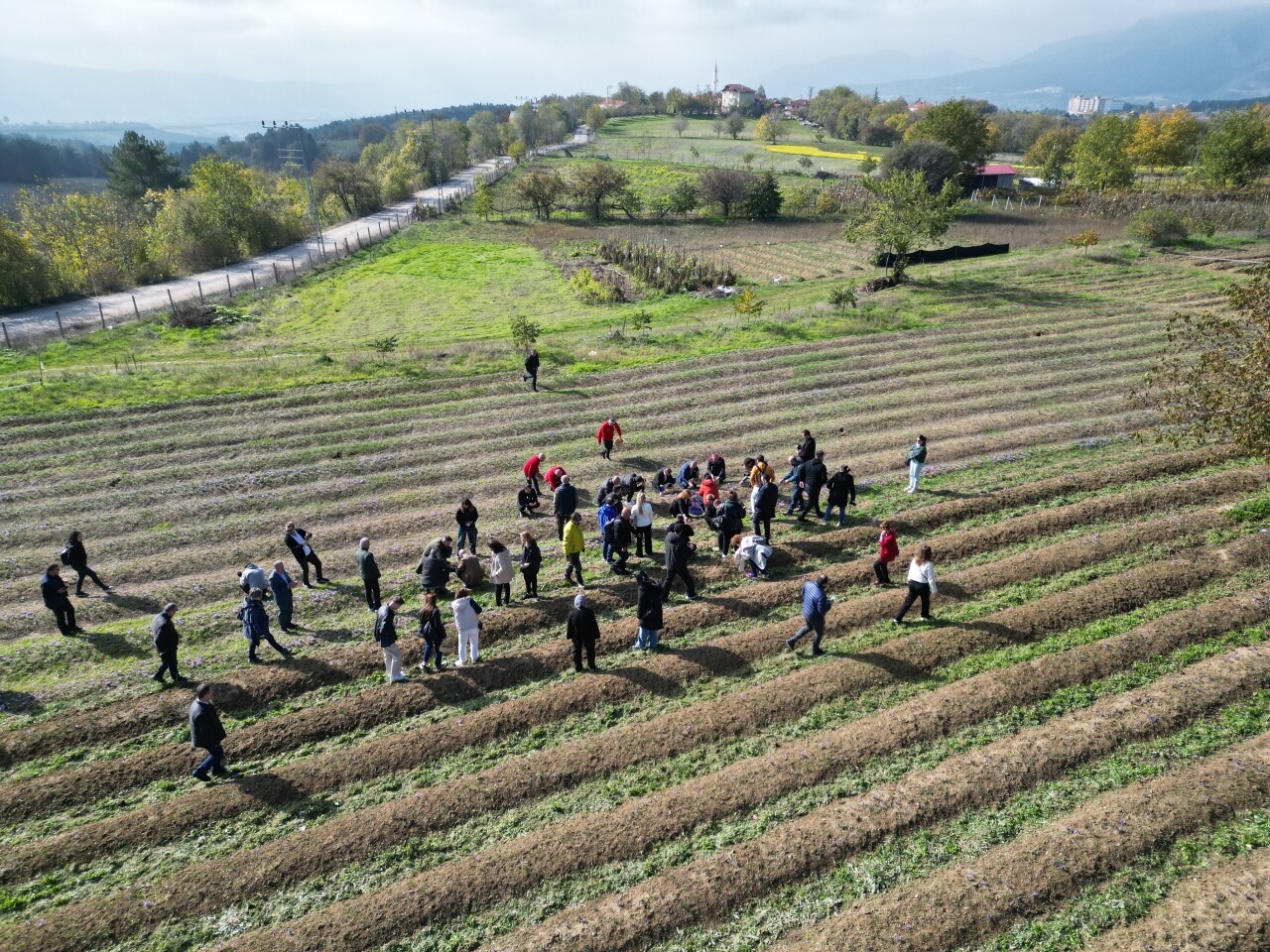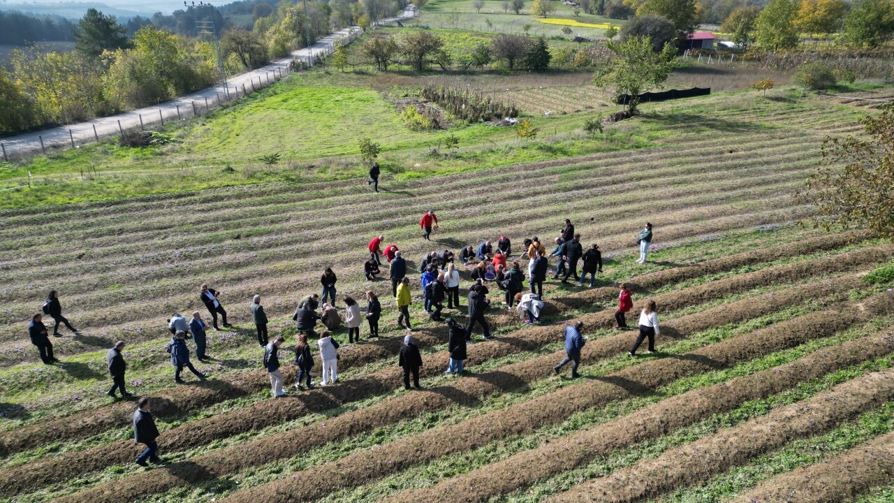 Yukarıçiftlik köyü Keten Mahallesi'nde İsmail Yılmaz'a ait safran tarlasında düzenlenen etkinlikte, katılımcılar tarlayı gezerek safran hasat etti.