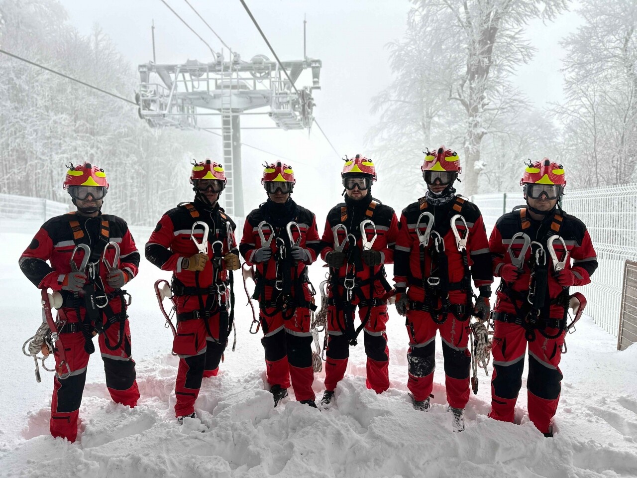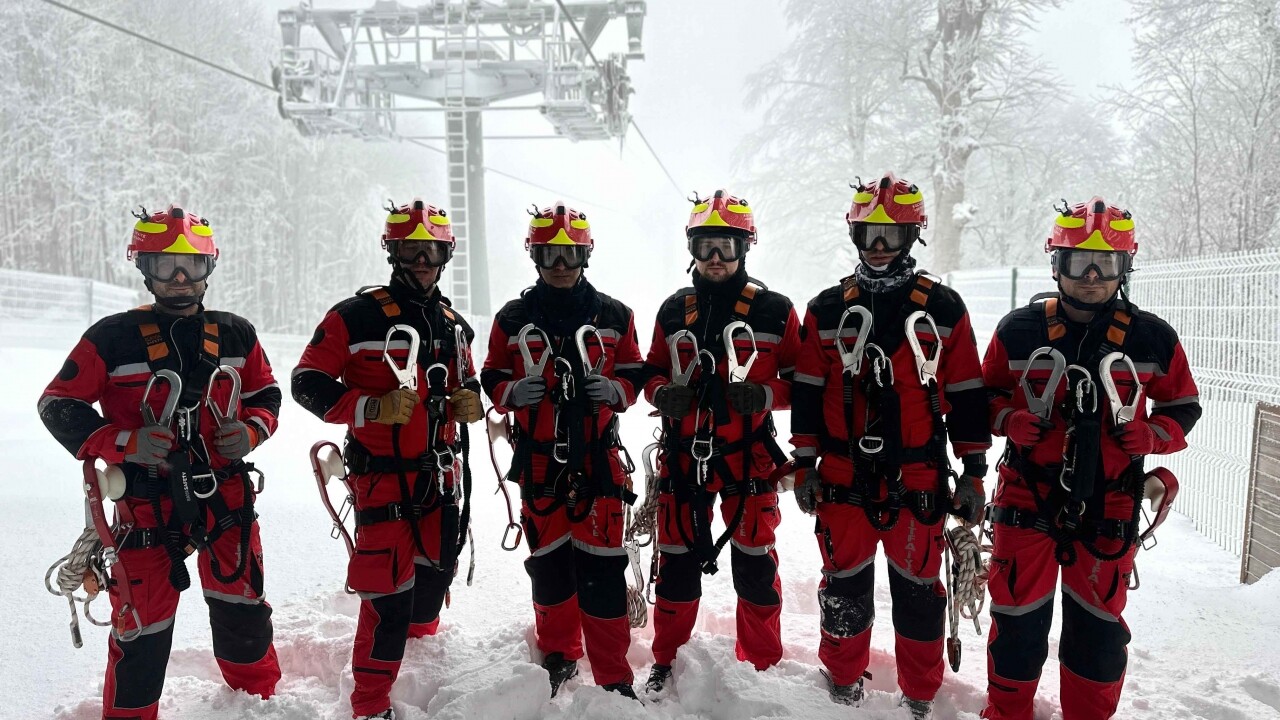 Kuzuyayla İstasyonu'nda yoğun kar yağışı altında gerçekleştirilen tatbikatta, itfaiye personeli iki direk arasında kalan kabindeki insanları kurtarmak için taşıma tellerinden kabine ulaşım sağladı.