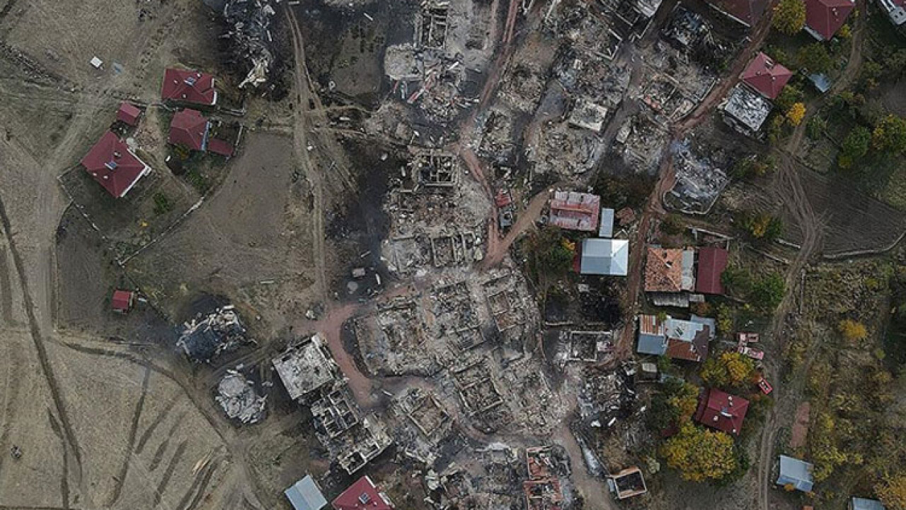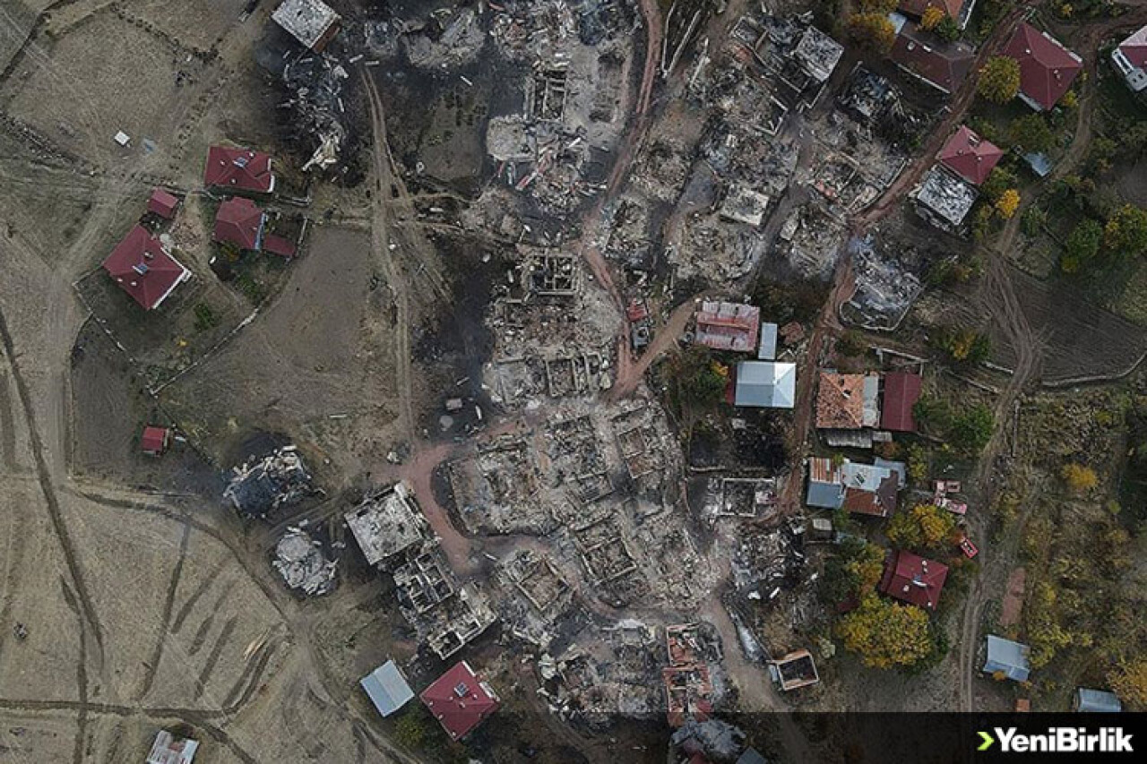 Evlerin yanı sıra büyük ve küçükbaş hayvanlar ile tarım aletlerinin de zarar gördüğü yangını AA ekibi dronla görüntüledi.