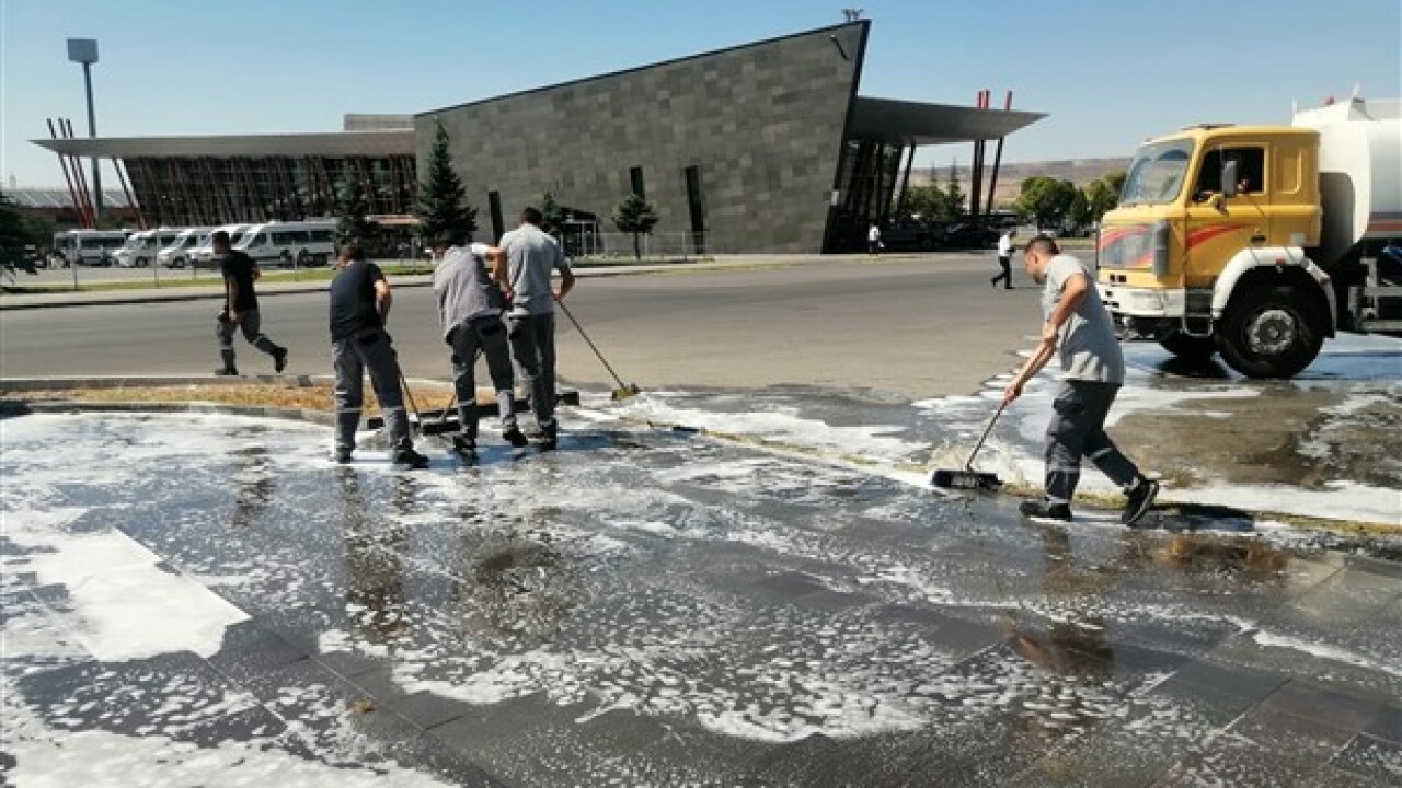 Çok sayıda temizlik görevlisi ve arazözler vasıtasıyla zamanla kirlenen otobüs terminali binası çevresi, bol su ve köpük kullanılarak kapsamlı bir şekilde temizlendi.