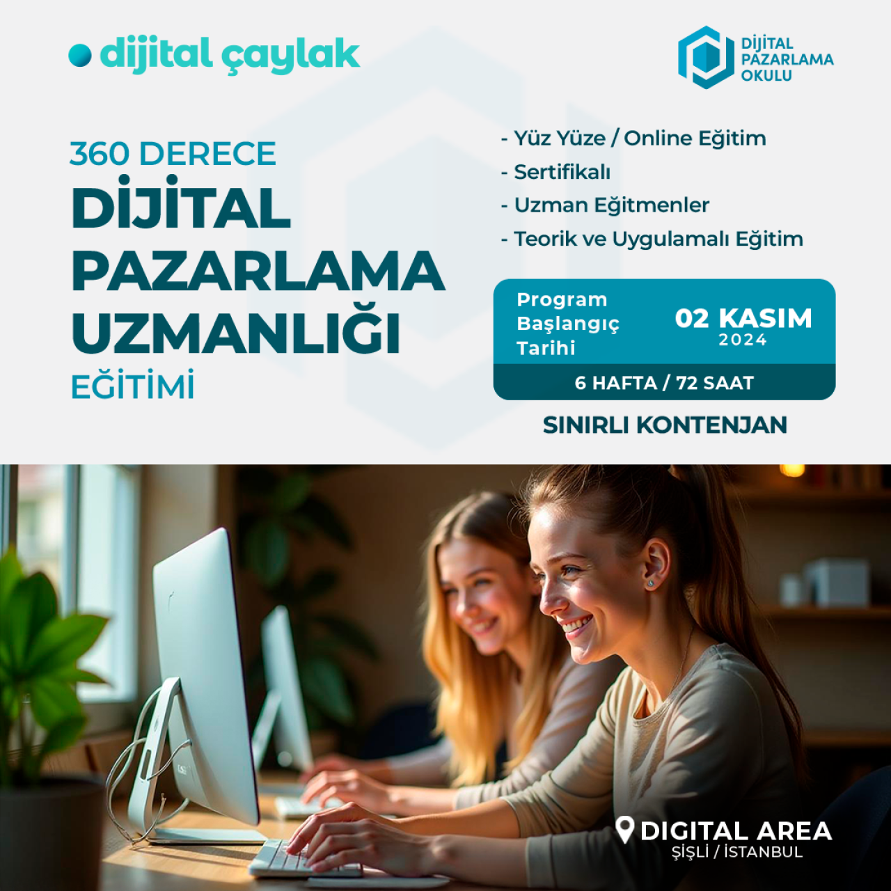Sınırlı kontenjan olduğunu ve başvuruların 1 Kasım 2024 tarihine kadar devam edeceğini söyleyen Kaplan, “Eğitim programlarında, SEO, SEM, Sosyal Medya Pazarlama, E-posta Pazarlama, İçerik Pazarlama, Web Analizi ve yapay zeka araçları gibi dijital pazarlamanın tüm önemli konuları ele alıyoruz. Bireysel ve kurumsal eğitimlerin yanı sıra özel eğitim programları da sunuyoruz. Projemize Lisans mezunu, Pazarlama alanına yönelmek isteyen kişiler, Ajans çalışanları, Pazarlama ekip yöneticileri, firma sahipleri, E-ticaret alanında çalışan veya bu alana yönelmek isteyen kişiler, kendi işini kurmak isteyenler, şirketlerin ajans ilişkileri ve sosyal medya süreçlerini yöneten kişiler katılabilirler. Dijital Pazarlama Okulu olarak, katılımcılarımızı dijital pazarlamada uzman birer profesyonel yapmak ve kariyerlerinde başarılı olmanızı sağlamak temel amacımız. Bu doğrultuda eğitim sürecini tamamlıyor, daha sonra sektörde başarılı olmalarını destekliyoruz” açıklamasında bulundu.