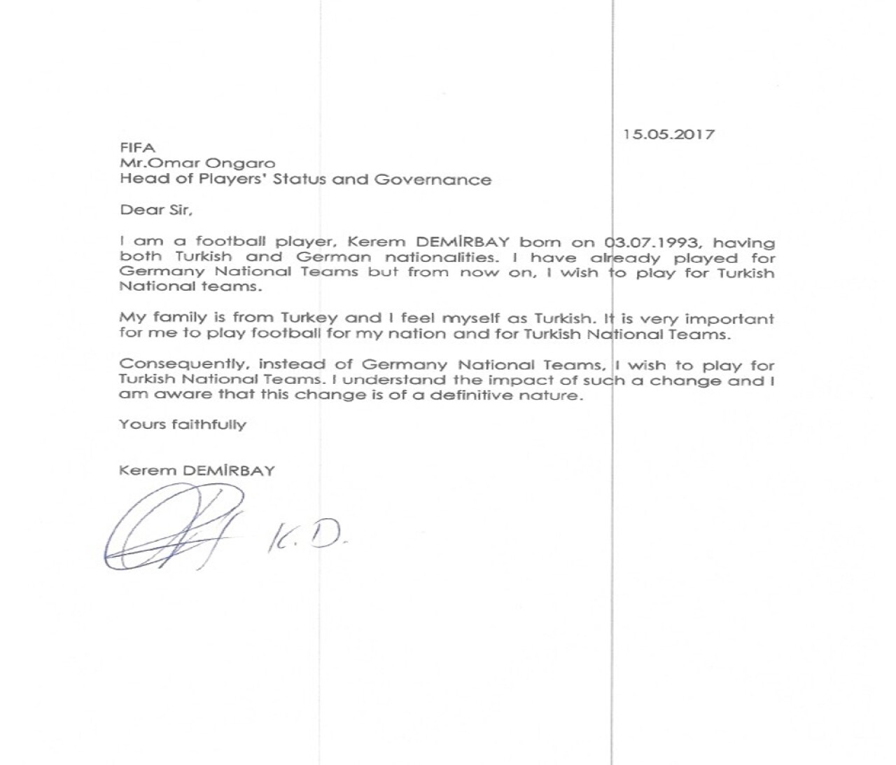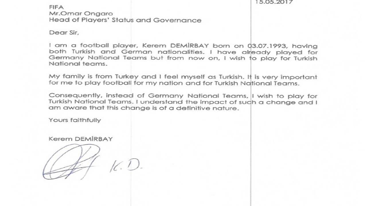 Aşağıda Kerem Demirbay’ın ıslak imzası ile Türk Milli Takımı’nı tercih ettiği belge, yasal sürece sokulmuşken, oyuncu ’son dakika’ kararını değiştirdiğini duyurmuştur.