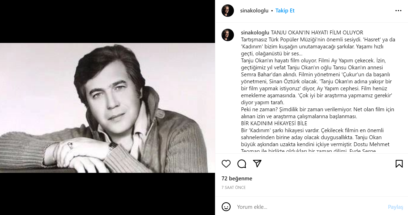 Sosyal medya hesabından Tanju Okan'ın filminin çekileceğine dair açıklama yapan Sinan Koloğlu şu ifadeleri kullandı: "Tartışmasız Türk Popüler Müziği'nin önemli sesiydi. 'Hasret' ya da 'Kadınım' bizim kuşağın unutamayacağı şarkılar. Yaşamı hızlı geçti, olağanüstü bir ses...