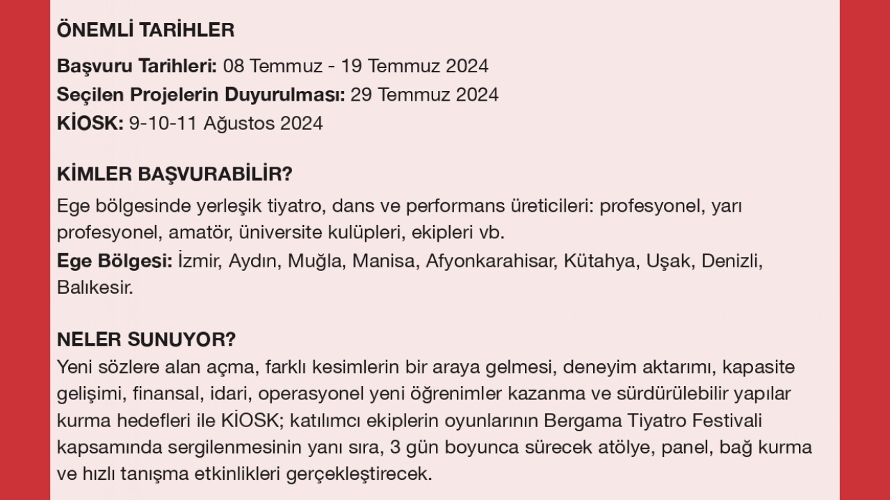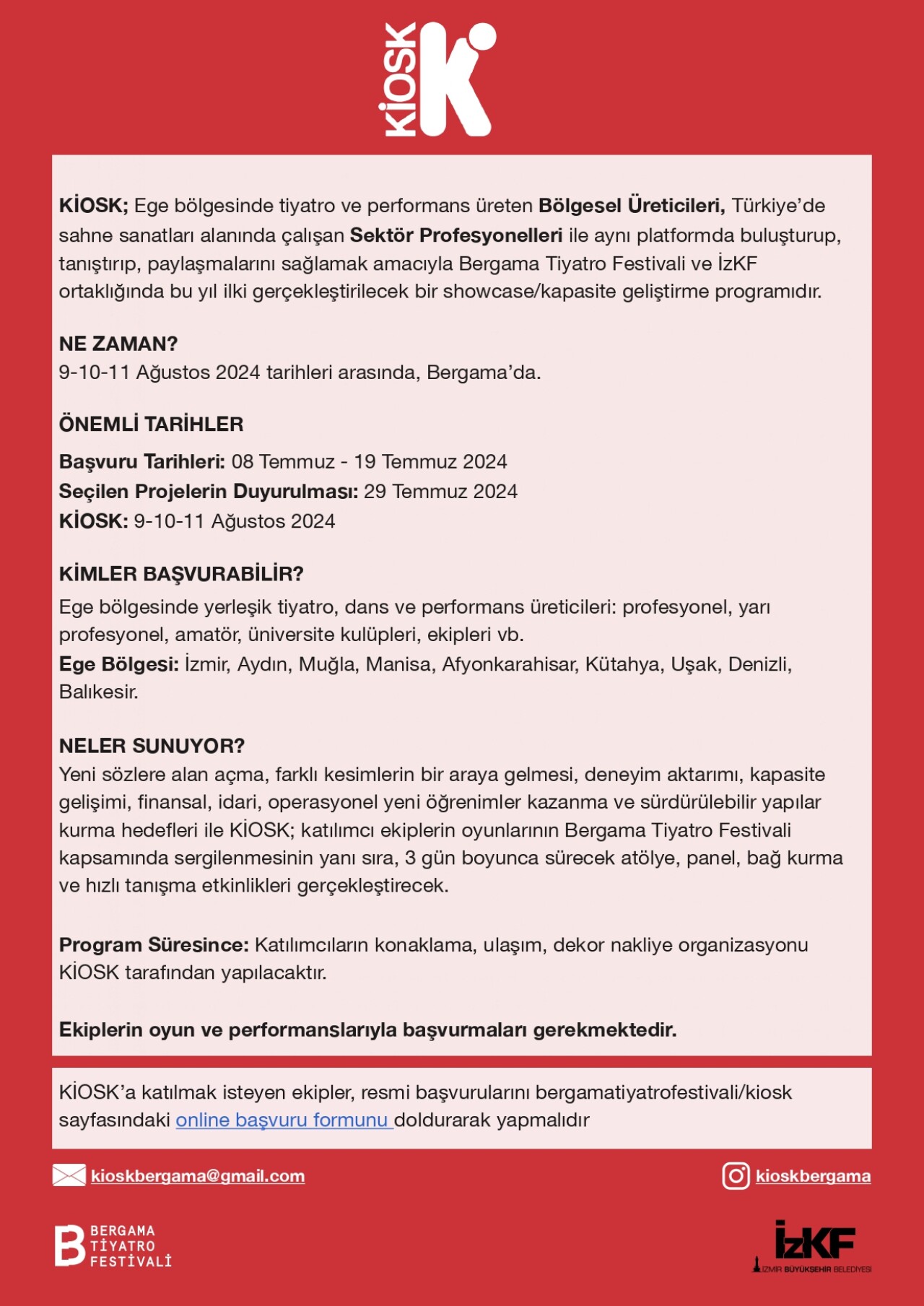 Bergama Tiyatro Festivali ve İzmir Kültür Fonu ortaklığıyla hayata geçen KİOSK’a son başvuru tarihi 19 Temmuz 2024. Detaylı bilgi ve başvurular için bergamatiyatrofestivali/kiosk adresini ziyaret edebilirsiniz.